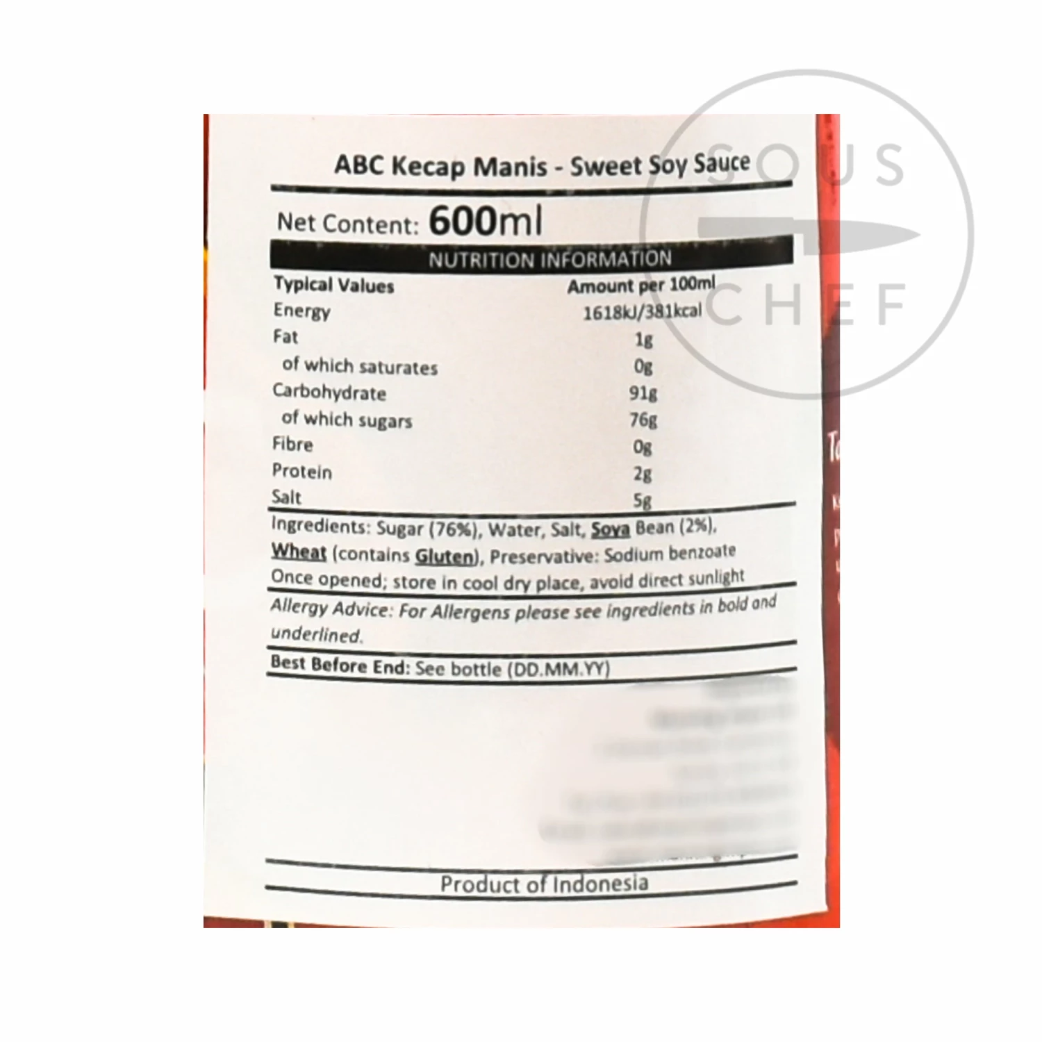Ingredients: sugar (76%), water, salt, soya bean (2%), wheat (contains gluten), preservative sodium benzoate.