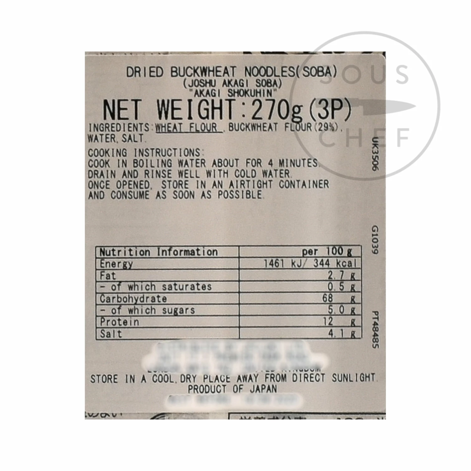 Akagi dried soba noodles are a fine buckwheat-based noodle, and are produced in Japan’s famous wheat district. The buckwheat gives the noodles are firmer texture and nutty taste. Soba noodles would traditionally be cut by knife rather than rolled, so the noodles have a distinctive square profile. Enjoy hot in a dashi based broth, or cold with a dipping sauce with a wasabi and spring onion garnish.
