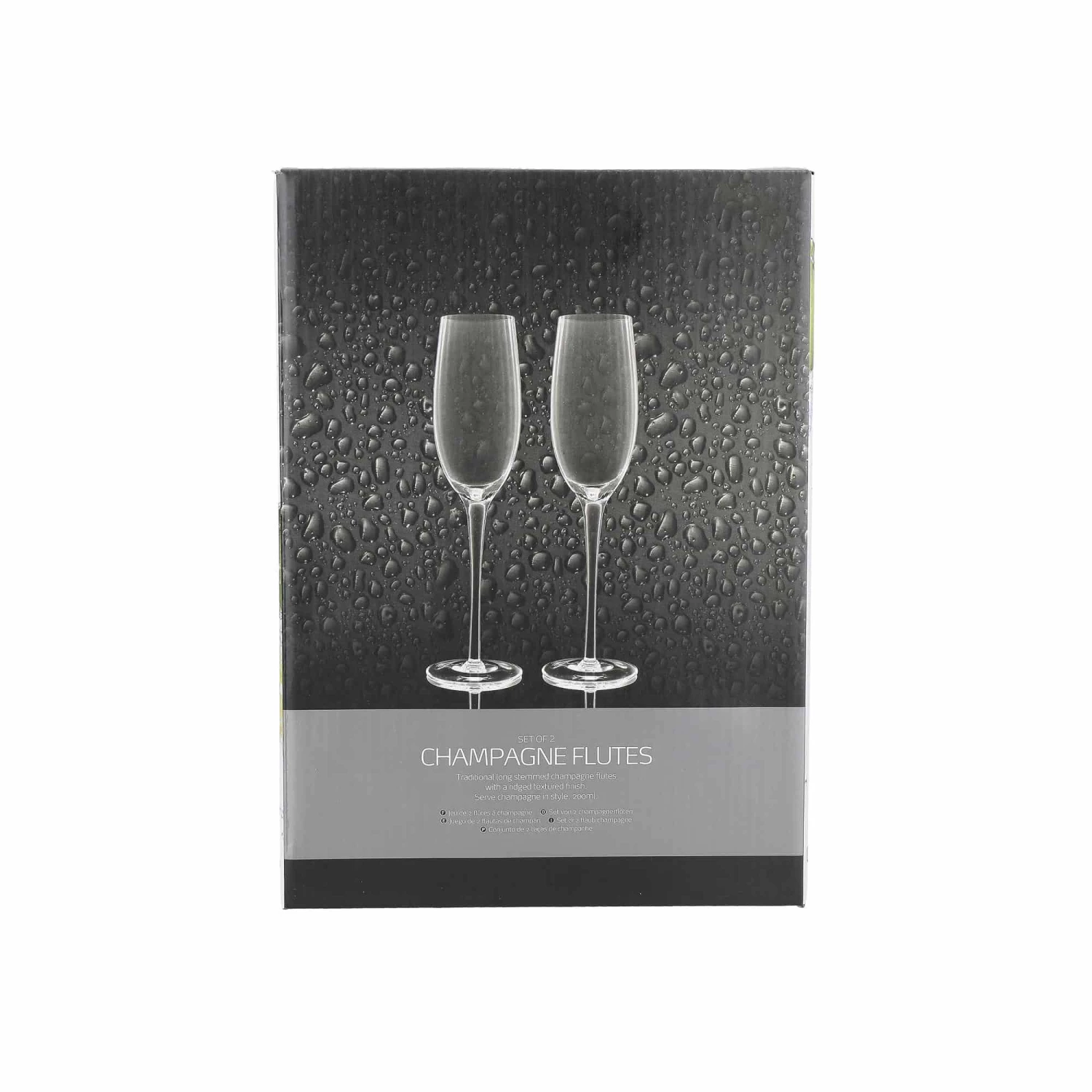 The flutes glasses have a subtle vertical rib pattern, and stand on elegant tall glass stems.