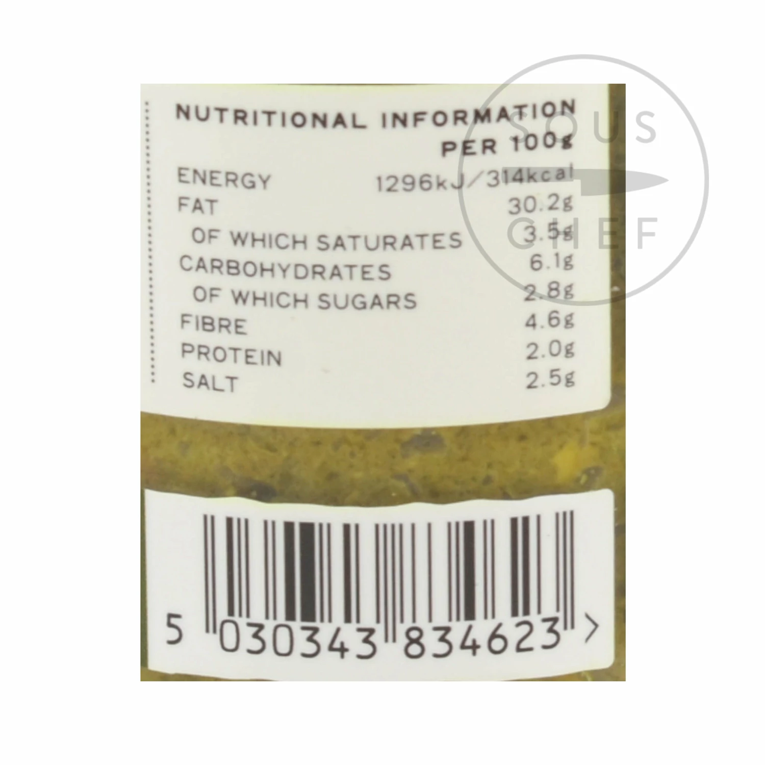 Ingredients: sunflower oil, preserved lemons (24%), onions, capers, fresh coriander (4%), fresh parsley, salt, cumin (2%), garlic puree, dried coriander, red chilli peppers, spices.