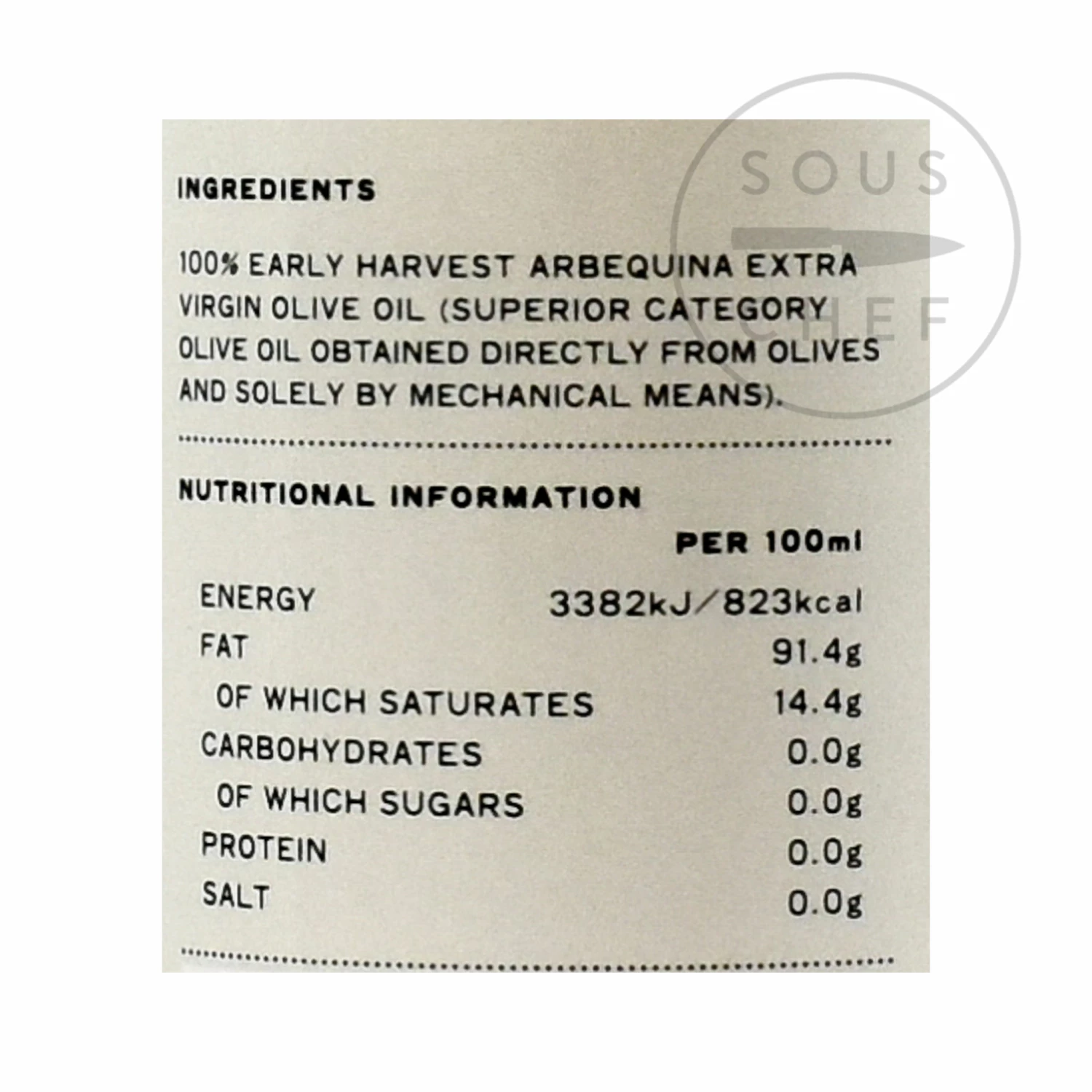 Ingredients: 100% early harvest Arbequina extra virgin olive oil (superior category olive oil obtained directly from olives and solely by mechanical means)