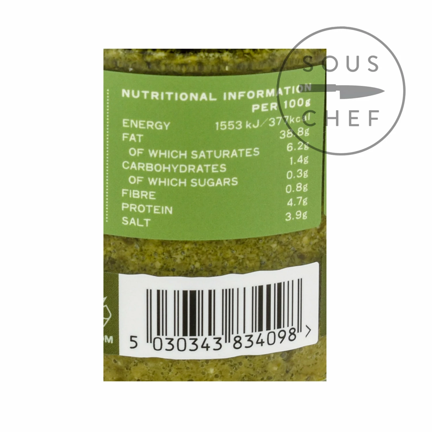Ingredients: Basil (45%), sunflower oil, Parmigiano Reggiano cheese (milk) (11%), extra virgin olive oil (2%), pine kernels (3%), salt, garlic puree, acidity regulator: lactic acid.