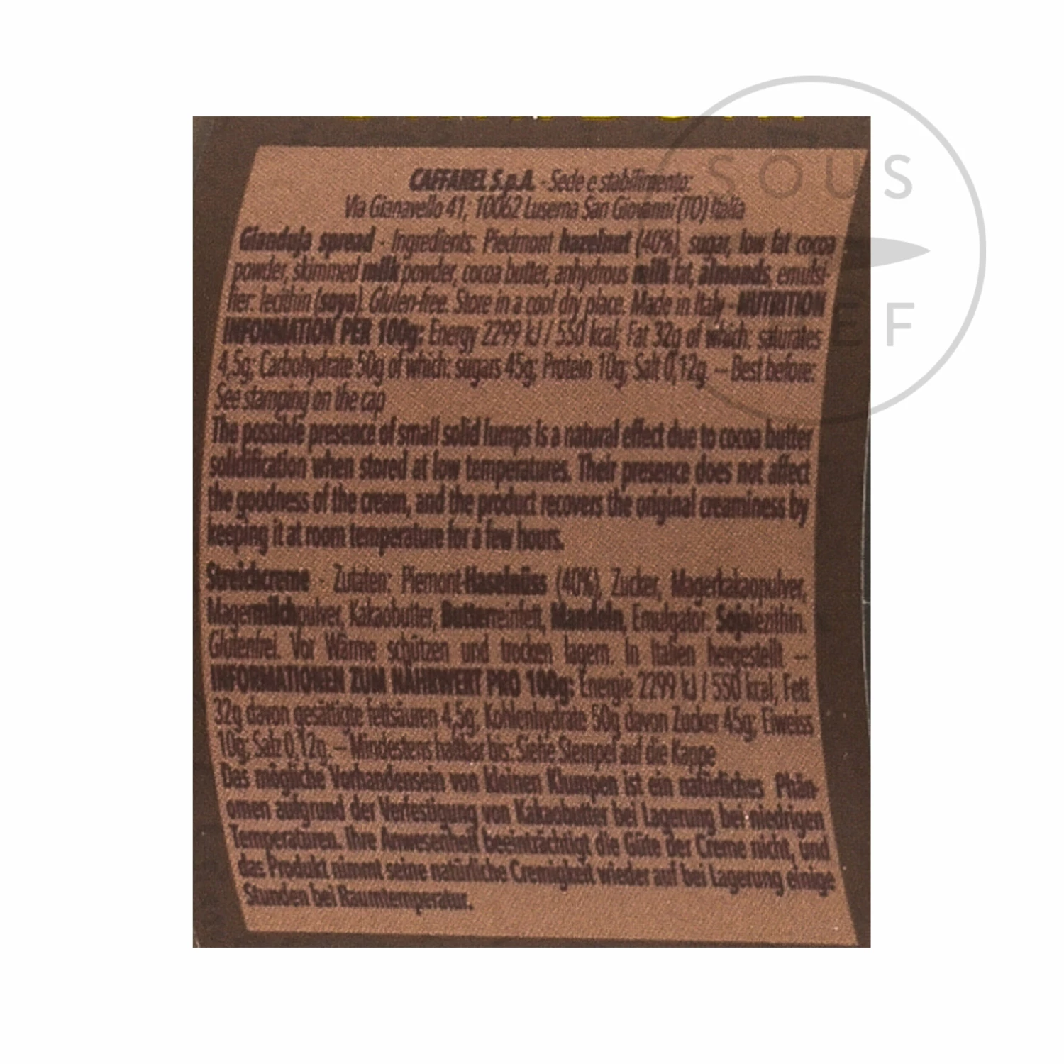 Caffarel premium Giandiua, or gianduja, spread is a taste of Italy’s original cocoa & hazelnut treat in a jar. Spread on freshly baked bread, in cakes and on biscuits. Or gently warm some of the chocolate and hazelnut spread in a bowl and use to dunk whole fruit and nuts in for after-dinner indulgence.