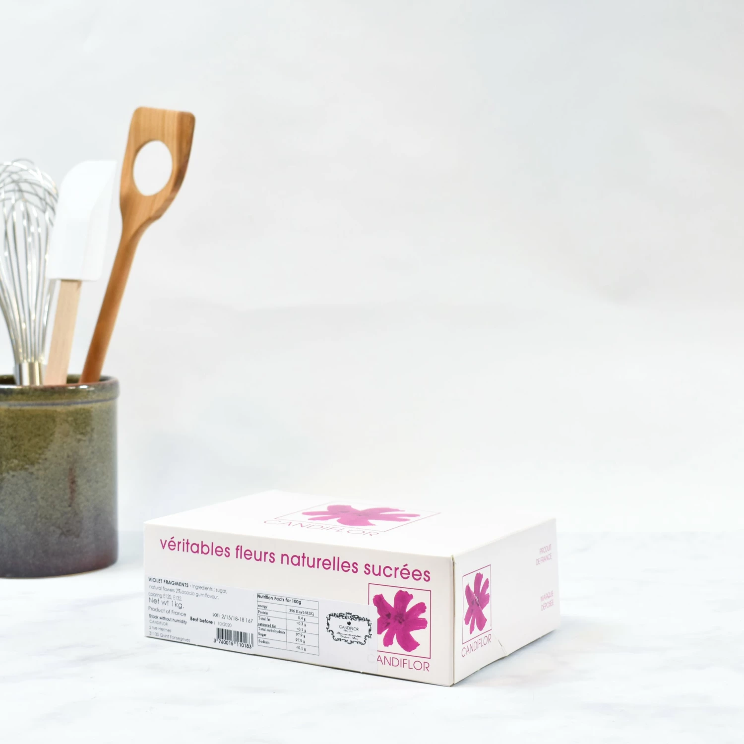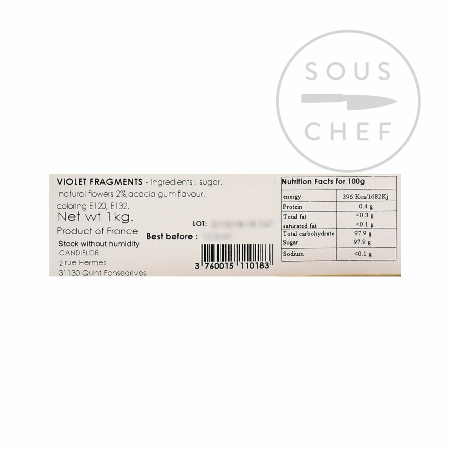 Ingredients: sugar, natural flowers (2%), acacia gum, colouring E120, E132, aroma.