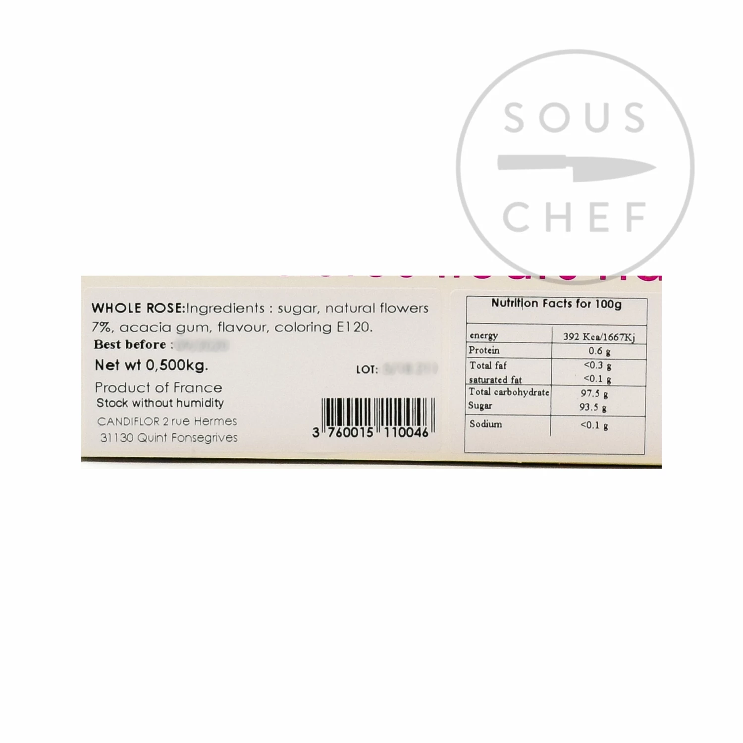 Ingredients: sugar (91%), natural roses flower (7%), gum arabic (2%), food colouring: E120, aroma.