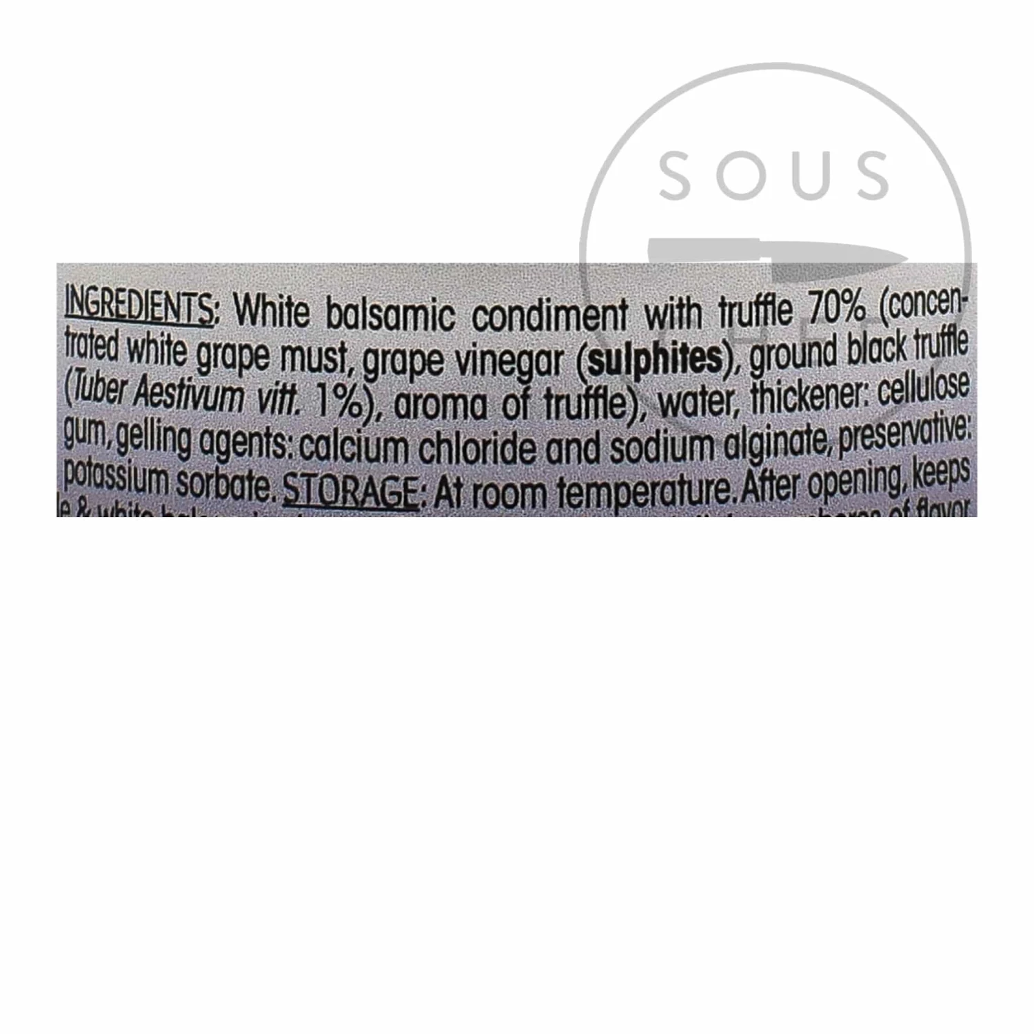 Ingredients: White balsamic condiment with 70% truffle (concentrated white grape must, grape vinegar (sulphites), ground black truffle (Tuber Aestivum vitt. 1%), aroma of truffle), water, thickener: cellulose gum, gelling agents: calcium chloride and sodium alginate, preservative: potassium sorbate.