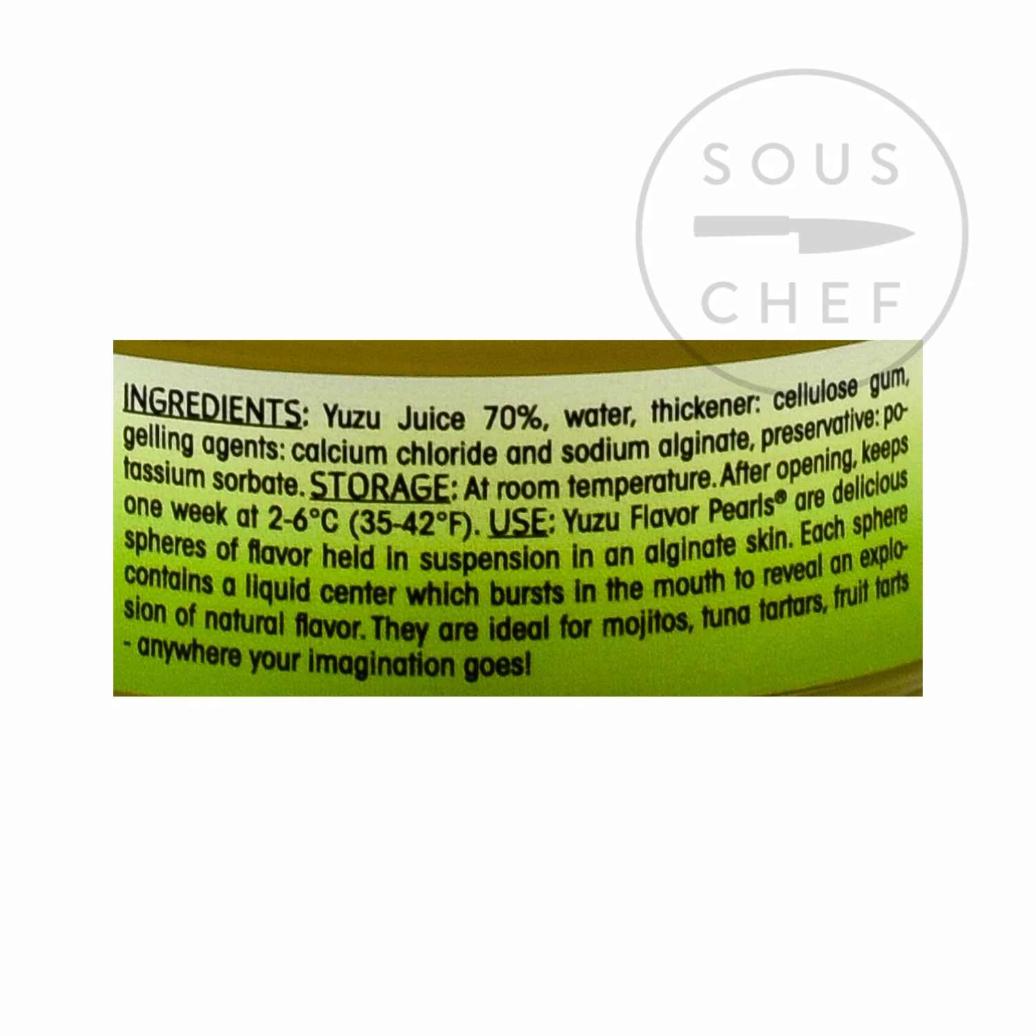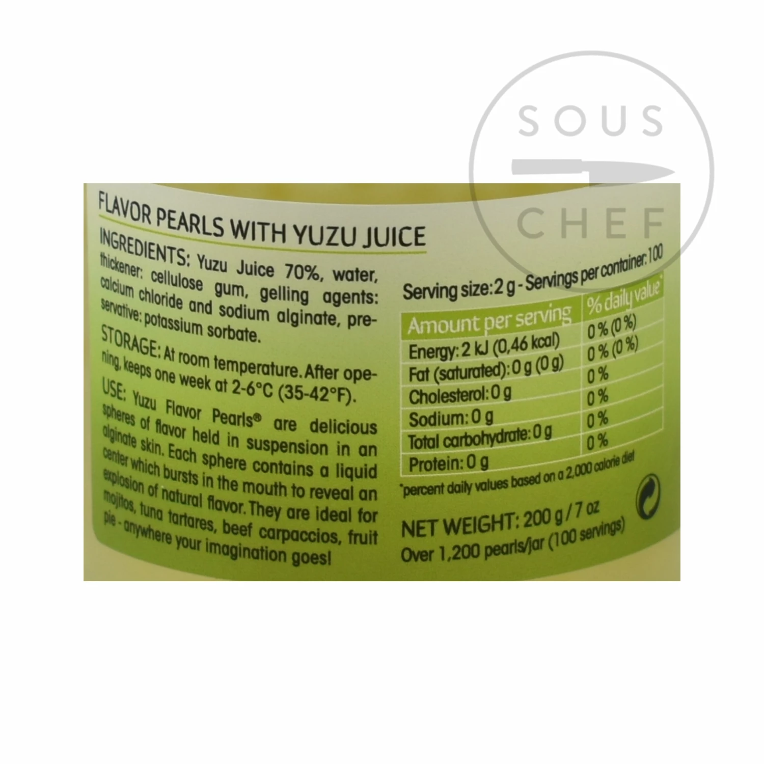 Ingredients: yuzu juice (70%), water, thickener: cellulose gum, gelling agents: calcium chloride and sodium alginate, preservative: potassium sorbate.