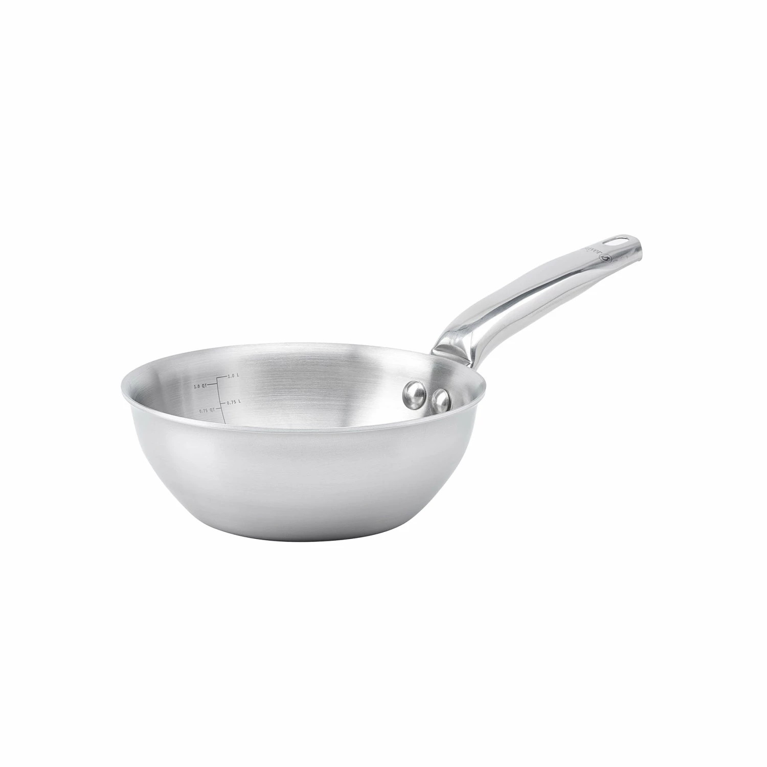 The saute pan has an ergonomic handle, cast from stainless steel and riveted to the pan for durability.
