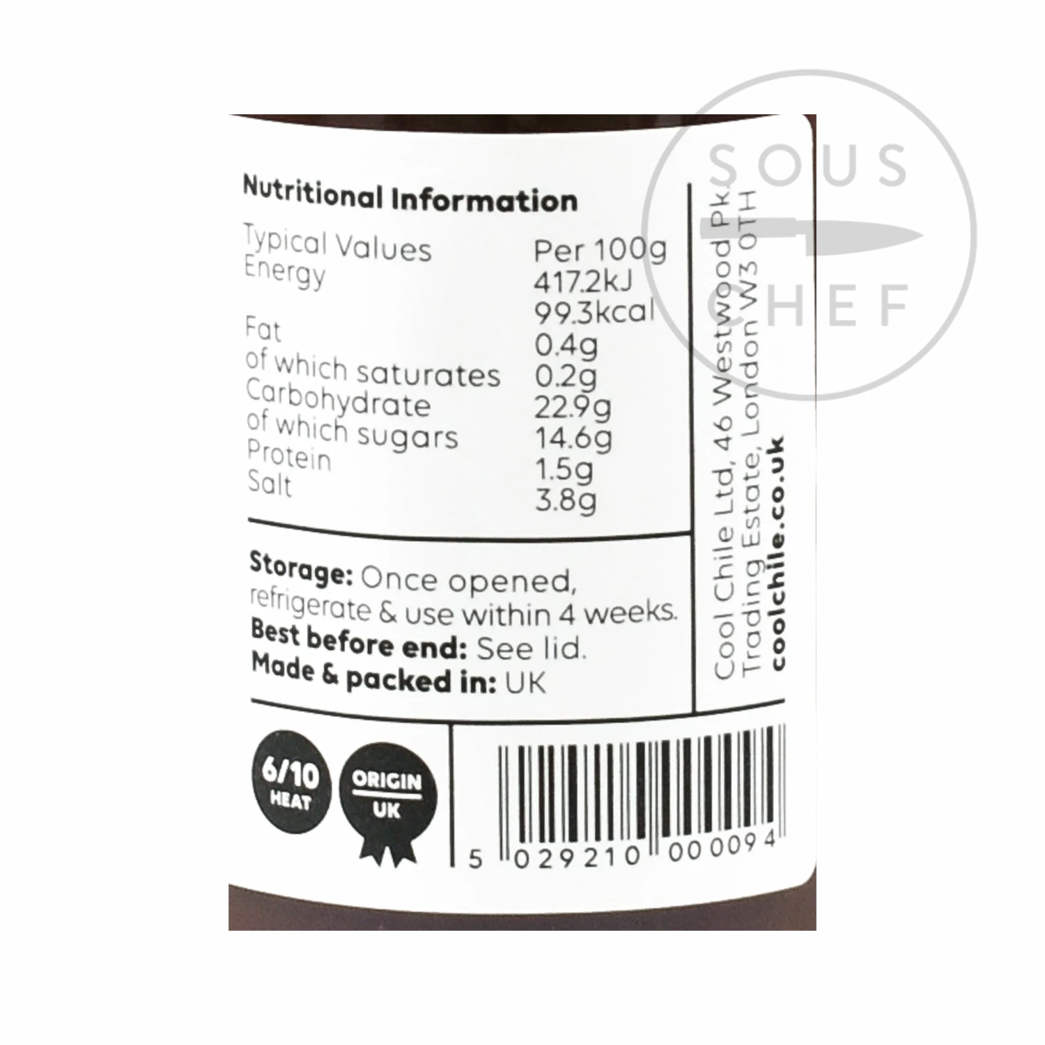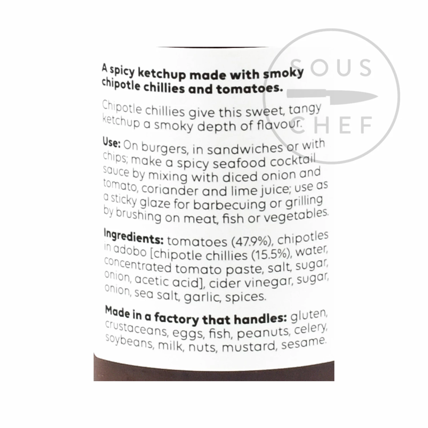 Ingredients: tomatoes (47.9%), Chipotles in Adobo [chipotle chillies (15.5%), water, tomato paste, salt, sugar, onion, acetic acid], cider vinegar, sugar, onion, sea salt, garlic, spices. Made in a factory that handles gluten, crustaceans, eggs, fish, peanuts, celery, soybeans, milk, nuts, mustard, sesame. Allergens are listed in bold.