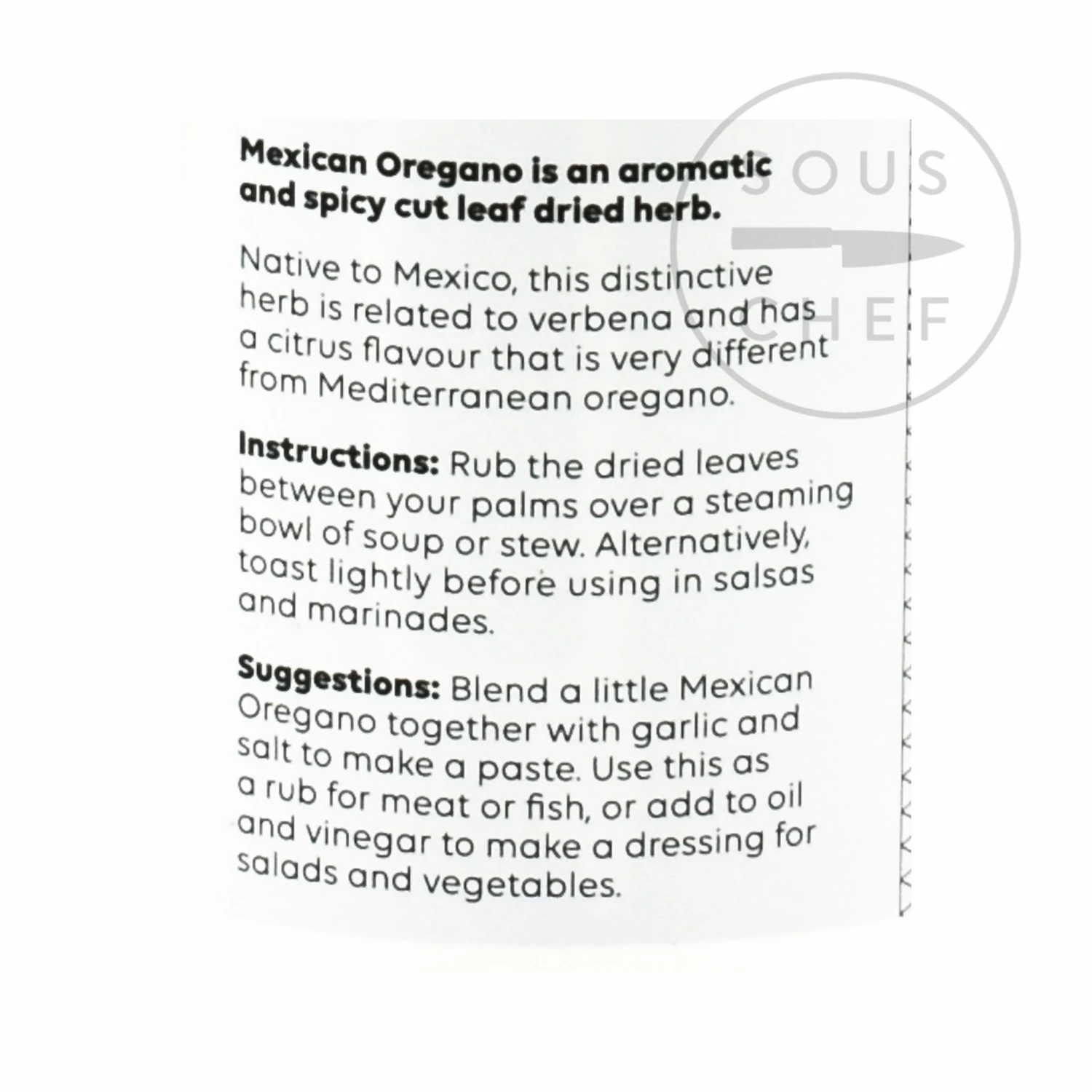 Dried Mexican oregano is strong and herbaceous with liquorice-lemon notes. Mexican oregano is misleadingly named – as it is, in fact, related to lemon verbena rather than Mediterranean oregano traditionally used in Greek and Italian cooking.