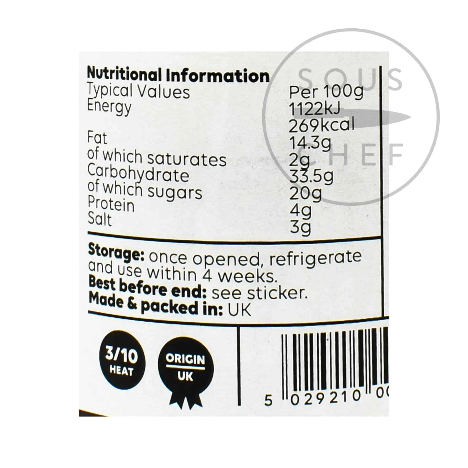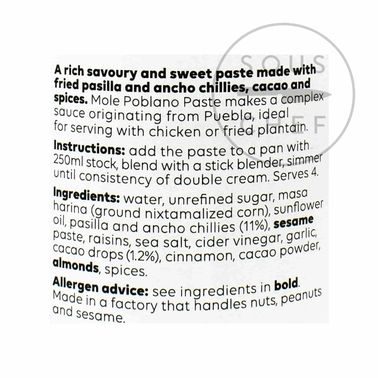 Ingredients: water, unrefined sugar, masa harina (ground nixtamalized corn), sunflower oil, pasilla and ancho chillies (11%), sesame paste, raisins, sea salt, cider vinegar, garlic, cocoa drops (1.2%), cinnamon, cocoa powder, almonds, spices.