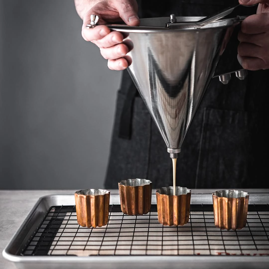 Pour the batter, sauce or glaze into the funnel. Press the lever on top of the funnel with your thumb to dispense a controlled stream into moulds, onto cakes or into glasses. The flow stops as soon as you release the lever to minimise drips.
