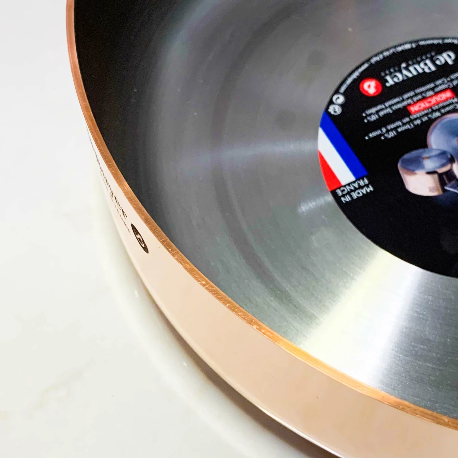 - No more re-tinning! Traditionally copper pans are lined with tin which wears away over time, so you would need to send your pan away to be ‘re-tinned’. Instead, De Buyer use a very thin coating of stainless steel which is durable, will last, and is easy to clean.