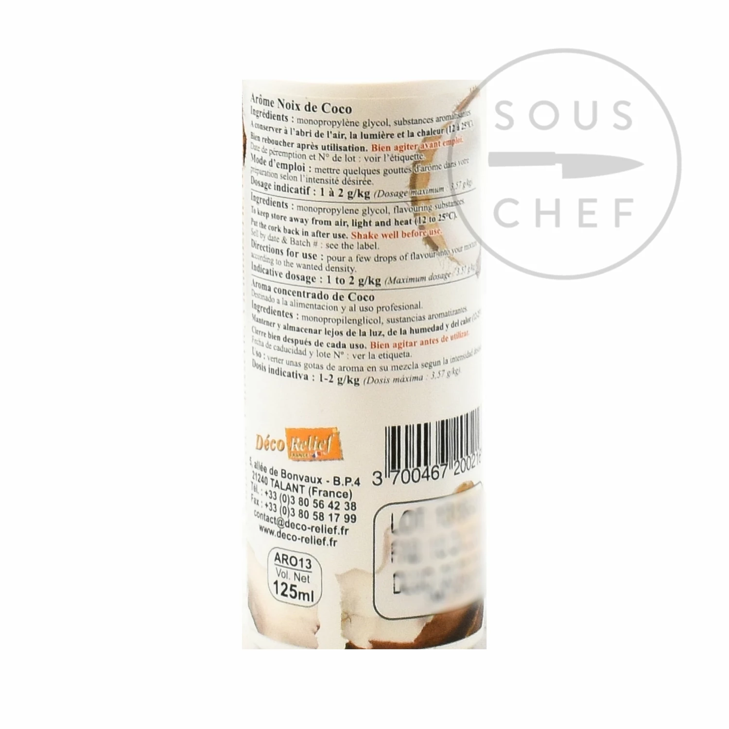 This concentrated coconut flavour brings an intense coconut flavour and aroma to baking and patisserie. Déco’relief concentrated aromas are used by top chefs and patissiers across France, in cakes, macarons, ganaches, sorbets, ice-creams, sweets and chocolates.