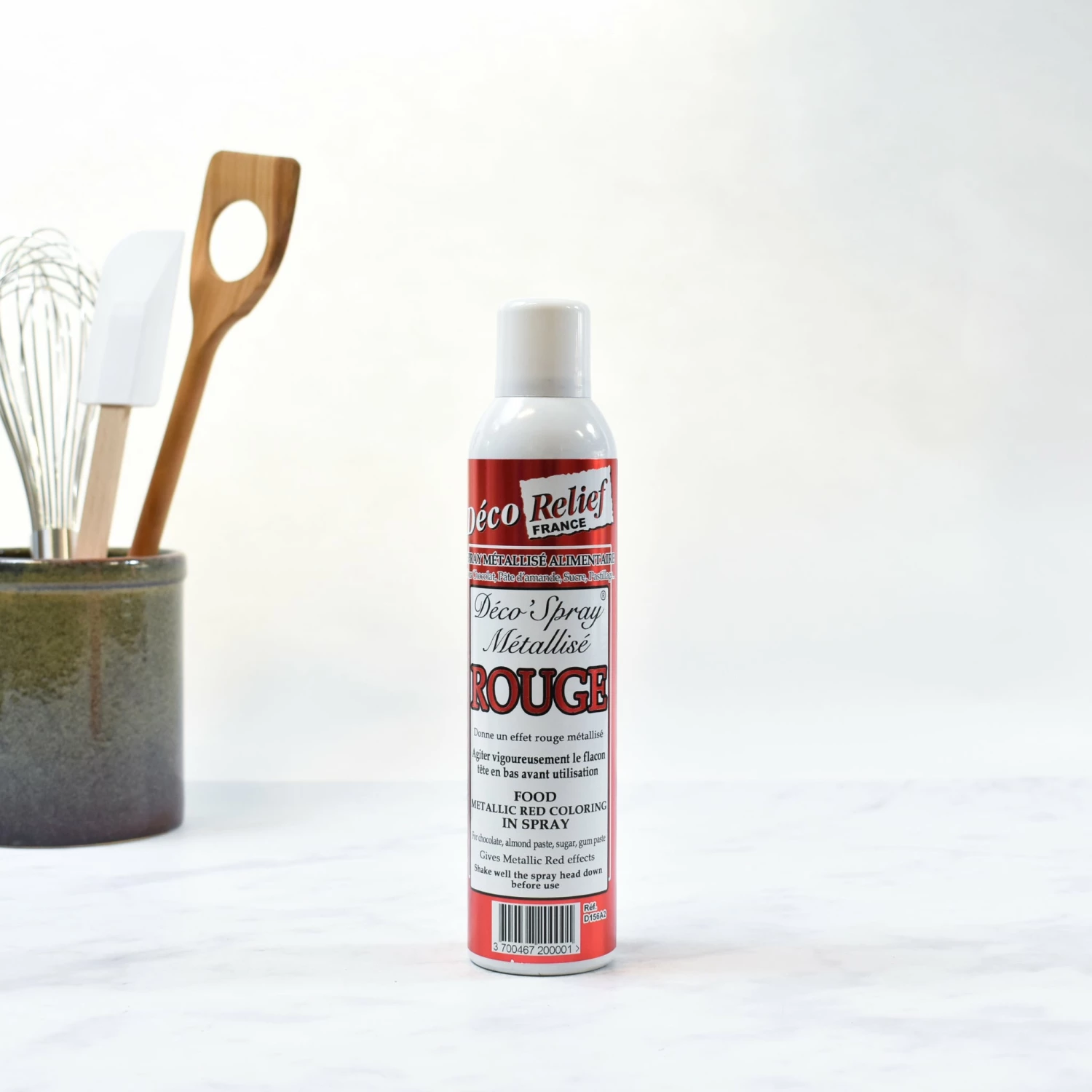 This edible metallic red spray brings a flawless metallic red coating to desserts, chocolates, icing and cakes. Use the edible metallic red food colouring spray can to create a fine metallic red finish on any patisserie. The metallic red finish looks spectacular – try adding a touch of glamour to a red velvet cake or to a batch of macarons.