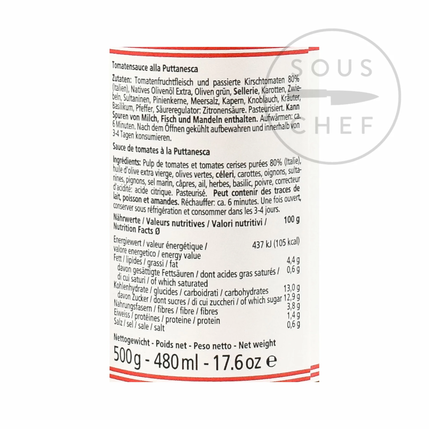 Ingredients: pulp of tomato and cherry tomato puree (80%), extra virgin olive oil, green olives, celery, carrots, onions, raisins, pine nuts, sea salt, capers, garlic, herbs, basil, pepper, acidifier: citric acid. Pasteurised. Allergens are listed in bold. May also contain traces of milk, fish and almonds.
