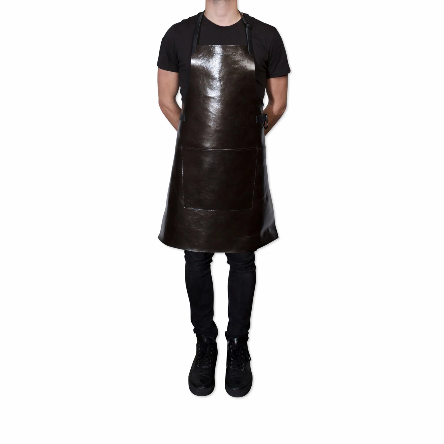 The handmade apron is made from 100% full grain leather and is finished in a transparent, dirt-repellent coating to keep it looking its best. The leather will soften and develop a patina over time – so the more you wear it, the better it will get! The apron has a fully adjustable neck strap, a large front pocket and towel loops at the waist. The apron also comes with carabiners, so you can keep things like tongs and spatulas close and keep your hands free.