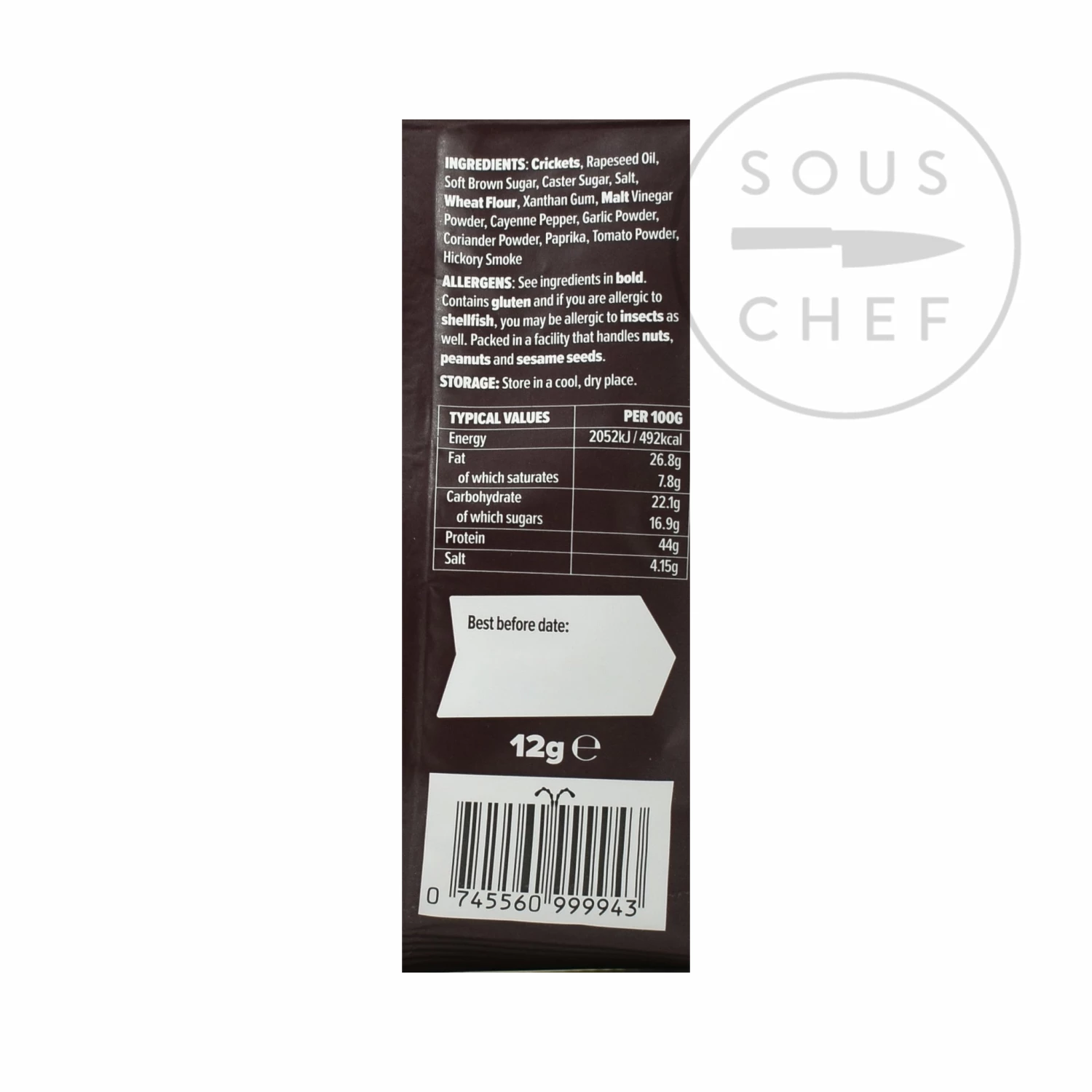 Ingredients: crickets, rapeseed oil, soft brown sugar, caster sugar, salt, wheat flour, xanthan gum, malt vinegar powder, cayenne pepper, garlic powder, coriander powder, paprika, tomato powder, hickory smoke. Allergens: See ingredients in bold. Contains gluten and if you are allergic to shellfish, you may be allergic to insects as well. Packed in a facility that handles nuts, peanuts and sesame seeds.