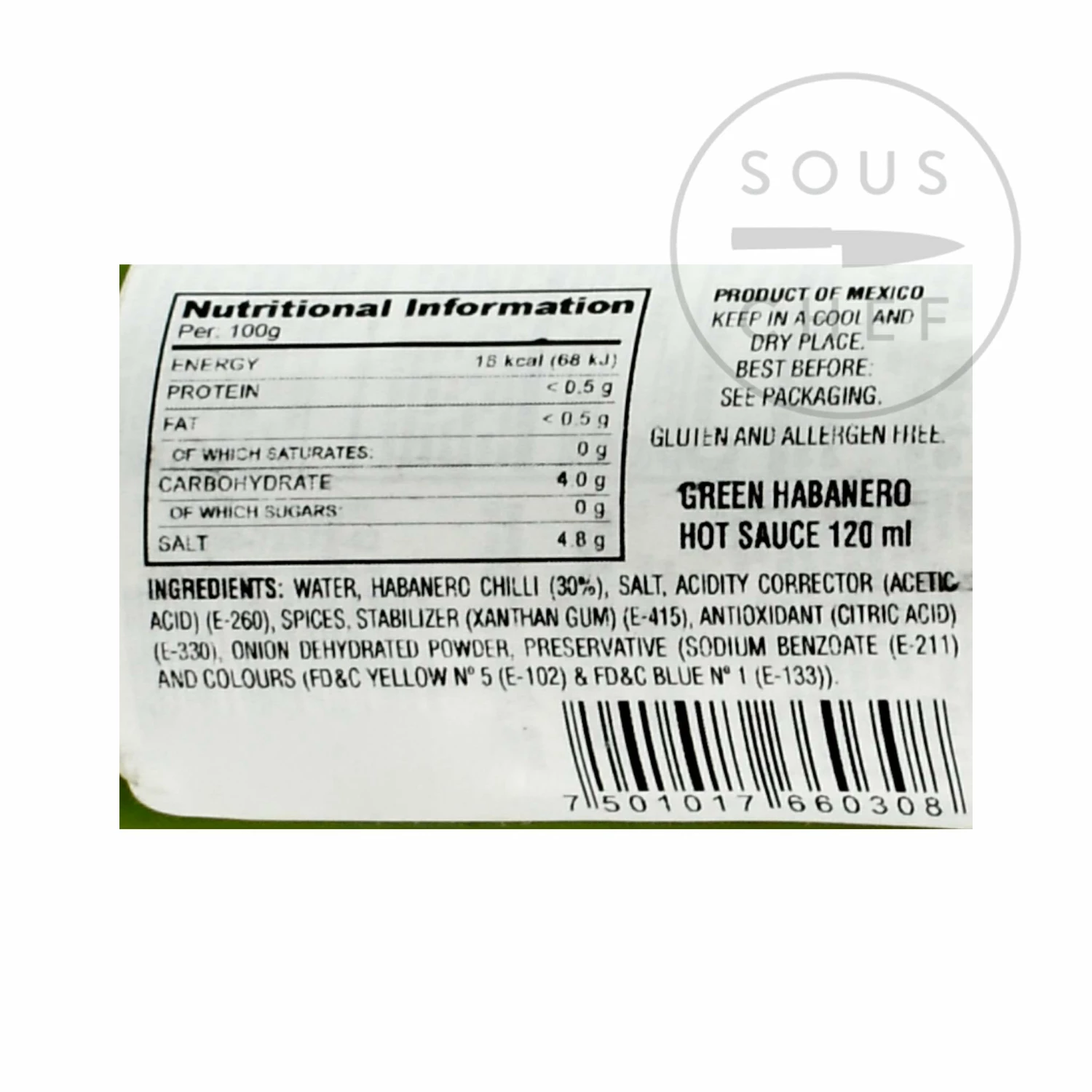 Ingredients: water, habanero chilli (30%), salt, acetic acid E260, spices, xanthan gum E415, citric acid E330, onion powder, sodium benzoate E211, yellow and blue colours E102* and E133. Gluten-free.