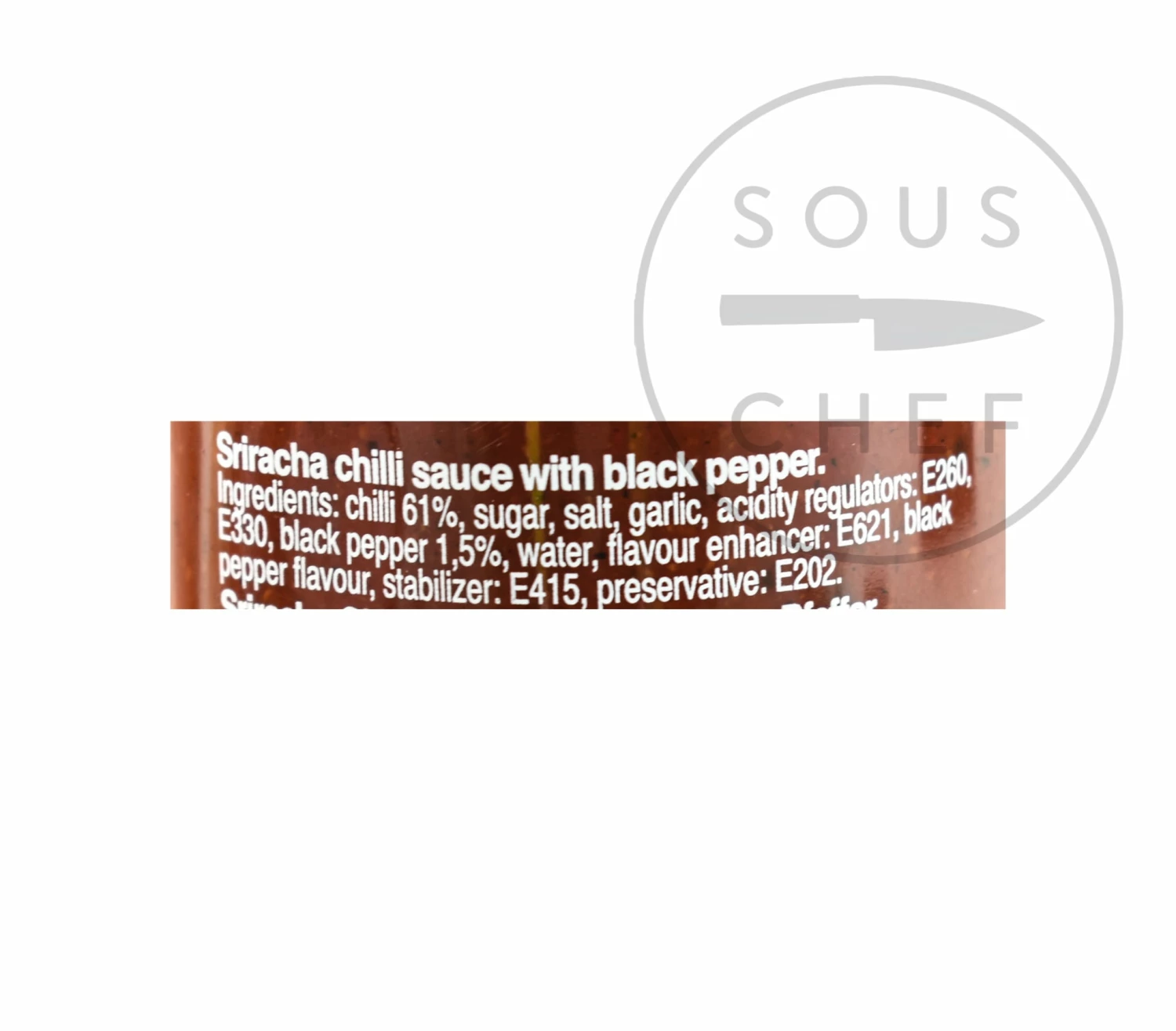 Ingredients: Chilli 61%, sugar, salt, garlic, acidity regulators: E260, E330, black pepper 1.5%, water, flavour enhancer: E621, black pepper flavour, stabiliser: E415, preservative: E202.