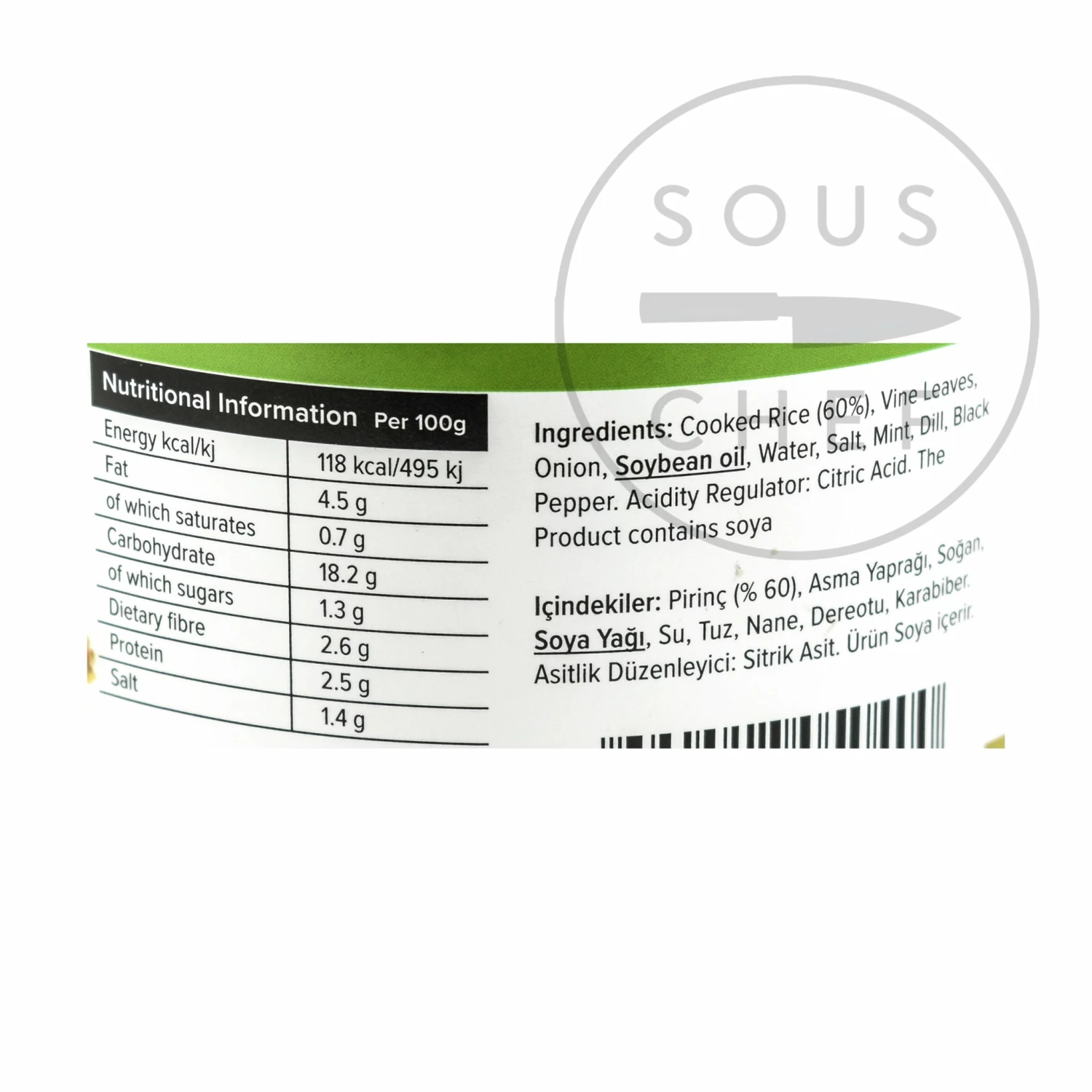 Ingredients: Cooked rice (60%), vine leaves, onion, soybean oil, water, salt, mint, dill, black pepper. Acidity regulator: citric acid.
