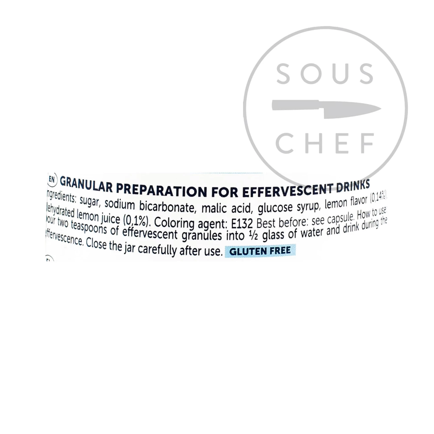 Ingredients: sugar, bicarbonate, malic acid, glucose syrup, lemon flavour (0.14%), dehydrated lemon juice (0.1%), colouring agent: 132.