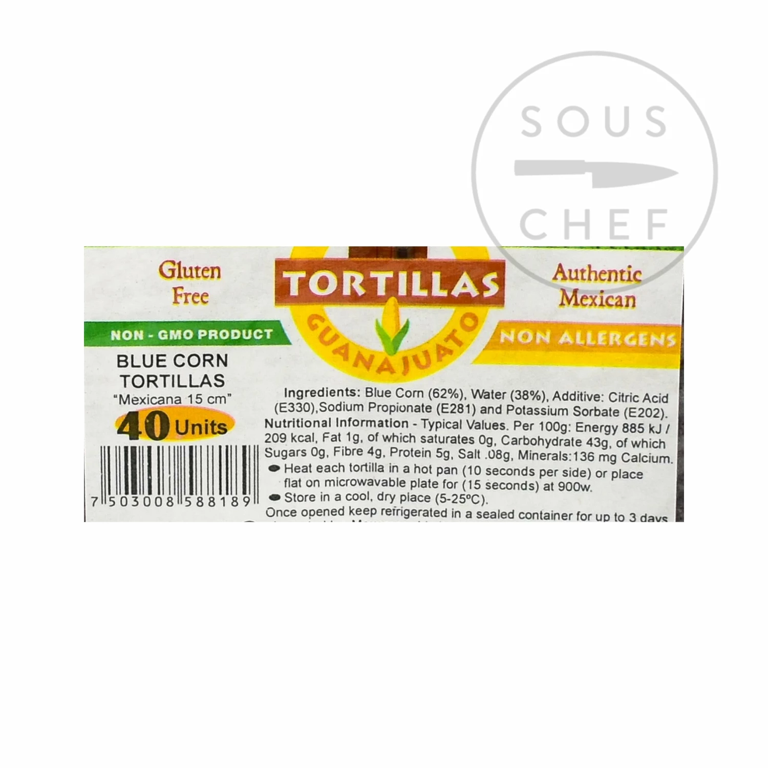 Ingredients: Blue corn 62%, water 38%, citric acid (E330), sodium propionate E281 and potassium sorbate (E202).