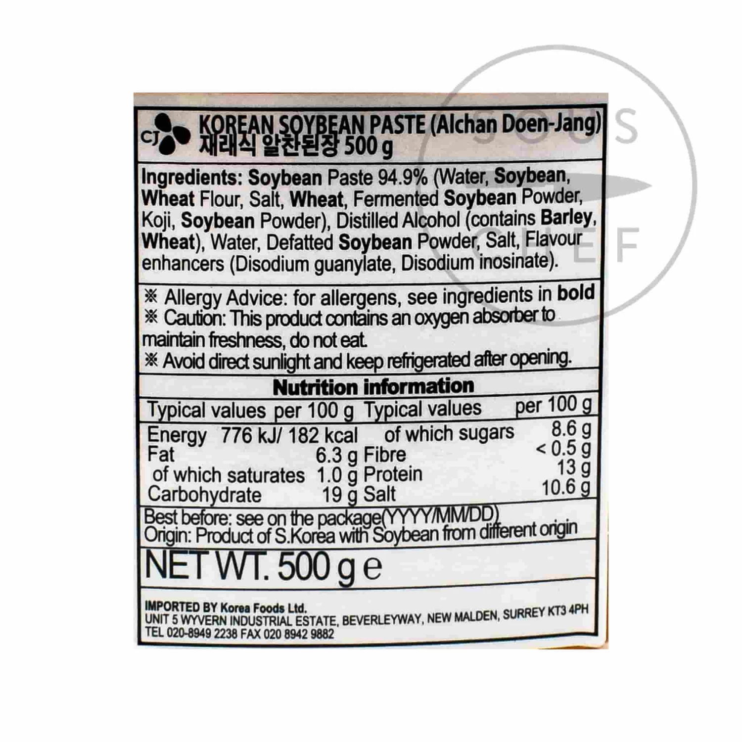 Ingredients: soybean paste 94.45% (water, soybean, wheat flour, salt, wheat, fermented soybean powder, koji, soybean powder), distilled alcohol (contains barley, wheat), water, defatted soybean powder, salt, favour enhancers (disodium guanylate, disodium inosinate).