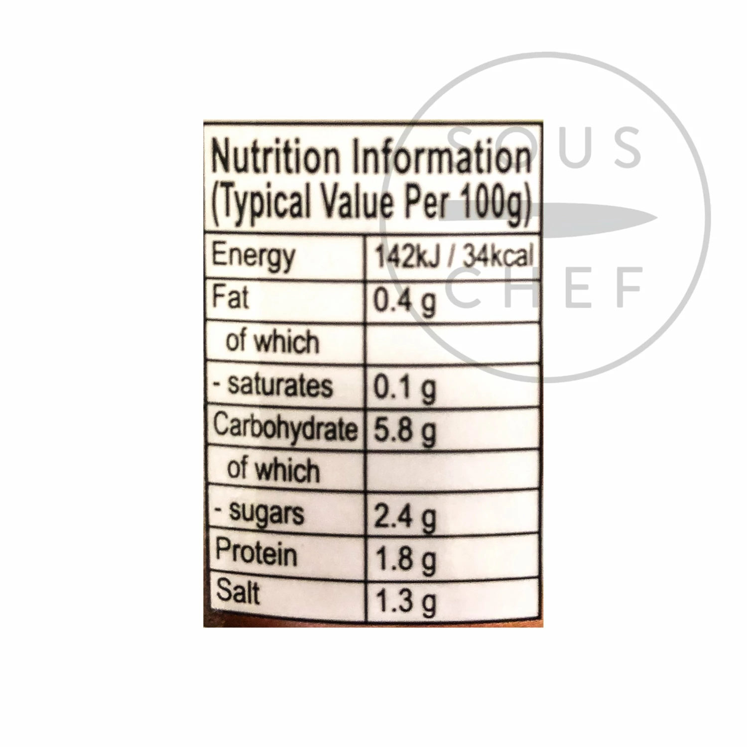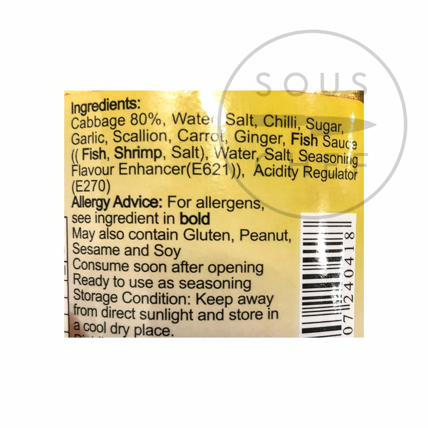 Ingredients: cabbage (80%,) water, salt, chilli, sugar, garlic, scallion (spring onion), carrot, ginger, fish sauce ([fish, shrimp, salt], water, salt, seasoning flavour enhancer [E621]), acidity regulator (E270).