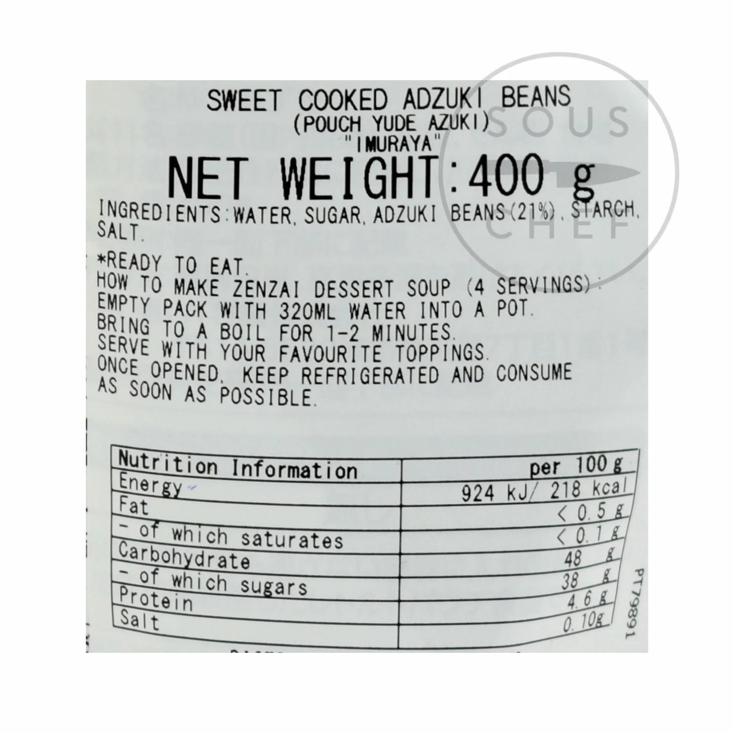Ingredients: Water, sugar, adzuki beans (21%), starch, salt.