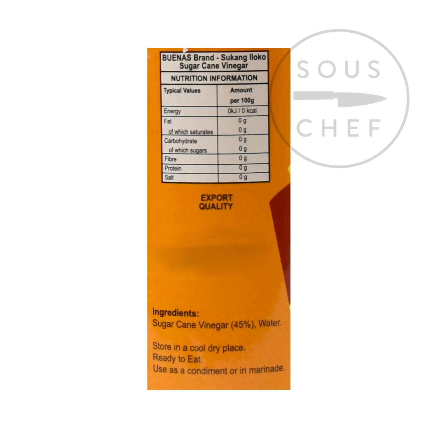 Buenas sugar cane vinegar – also known as sukang iloko – is a mild but distinctive vinegar in Filipino cuisine. It’s often used to make sweet & sour sauces in Filipino cuisine. It is made from fermented sugar cane juice, a process that makes the finished vinegar more sour than sweet, tasting like a lightly vinegared apple juice.
