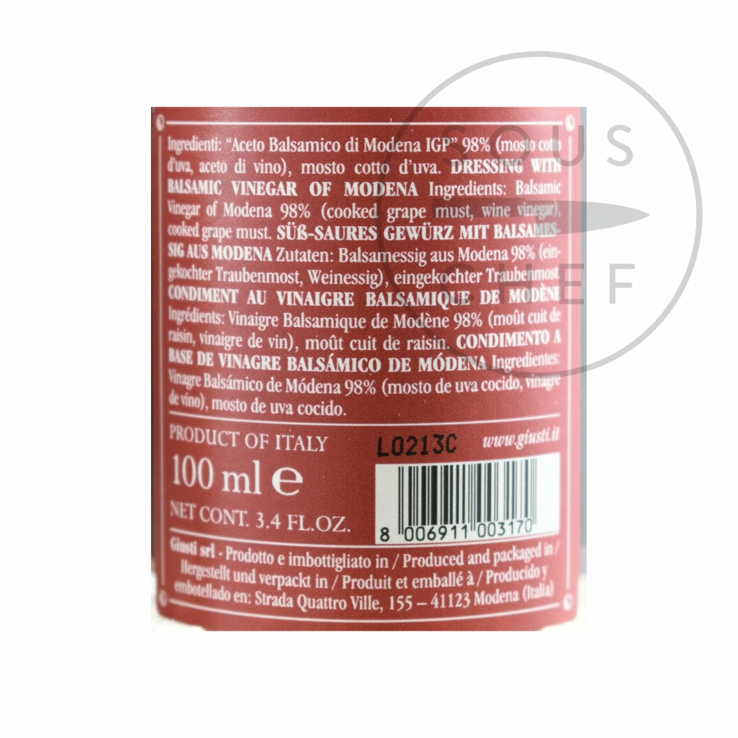 Ingredients: Balsamic vinegar of Modena 98% (cooked grape must, wine vinegar), cooked grape must.