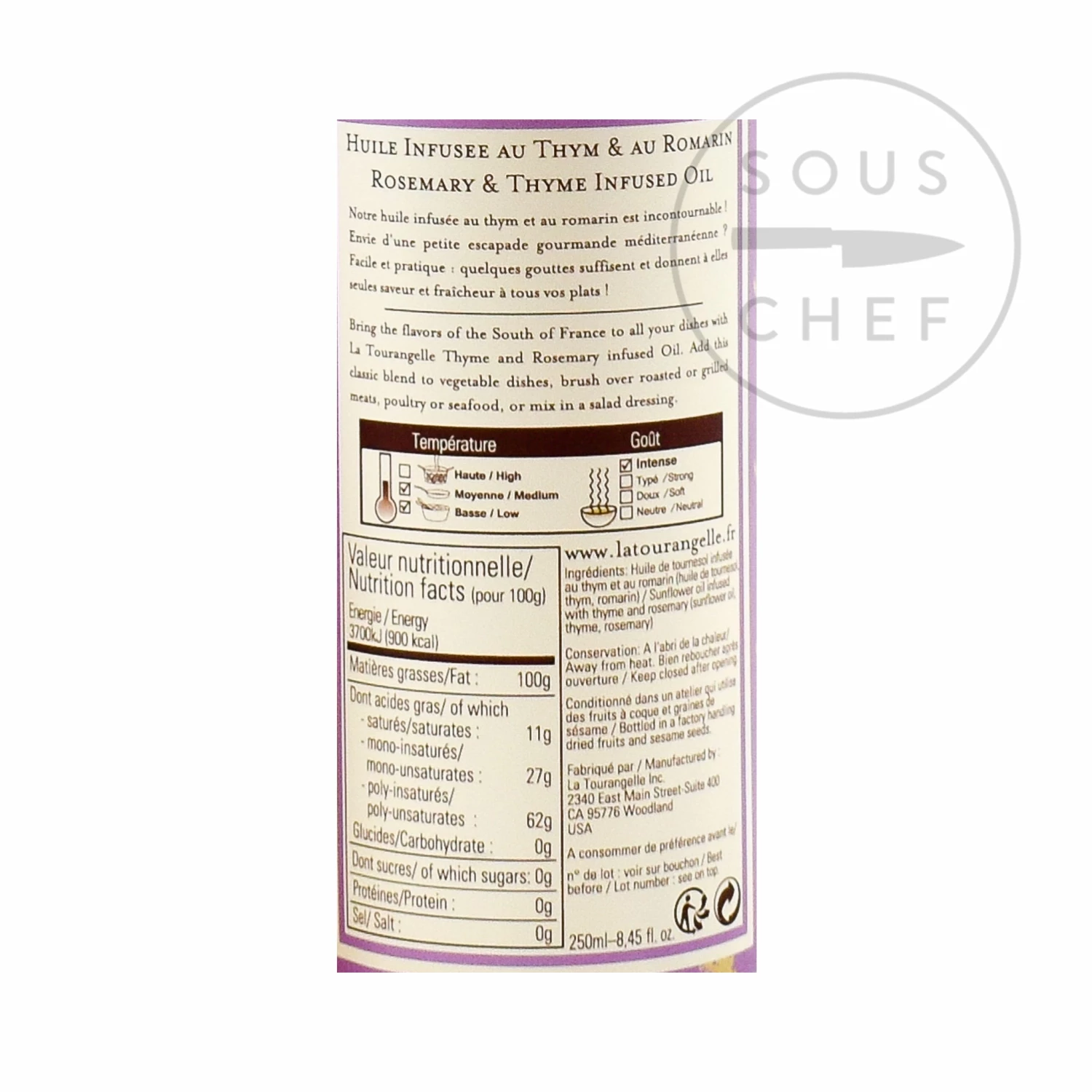 La Tourangelle select the freshest rosemary and thyme to infuse in their sunflower oil for an intense flavour. As well as being a great finishing oil for vegetables, chicken and salads, the infused oil is also suitable for cooking at low and medium temperatures. Try adding to a casserole or stew during cooking, or even add to the pan towards the end of frying potatoes.