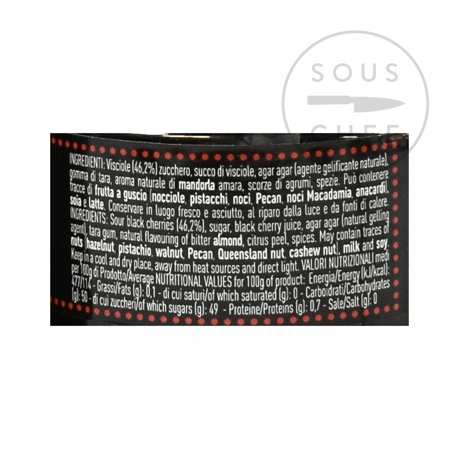 Ingredients: sour black cherries (46.2%), sugar, black cherry juice, agar agar (natural gelling agent), tara gum, natural flavouring of bitter almond, citrus peel, spices. Allergens are listed in bold. May also contain traces of nuts (hazelnut, pistachio, walnut, Pecan, Queensland nut, cashew nut), milk, and soy. May contain cores.