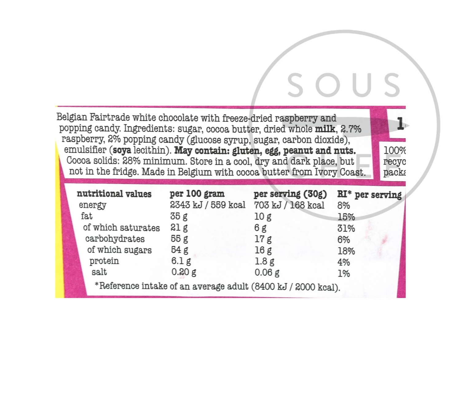 Ingredients: Sugar, cocoa butter, dried whole milk, 2.7% raspberry, 2% popping candy (glucose syrup, sugar, carbon dioxide), emulsifier (soya lecithin).
