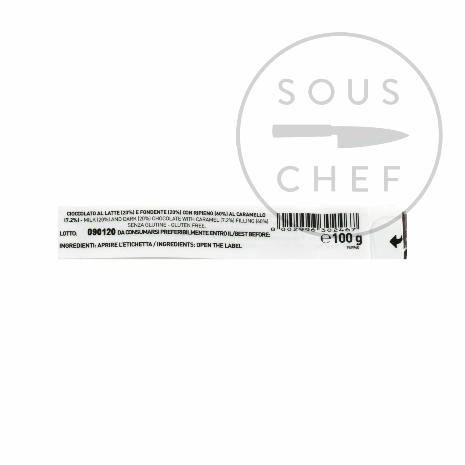 Ingredients: Sugar, cocoa butter, Piedmont hazelnut paste, cocoa mass, whole milk powder, caramel – 7.2% (sugar, glucose syrup, cream (from milk), butter (from milk)), cocoa powder, emulsifier: soy lecithin, anhydrous milk fat, natural vanilla flavour.