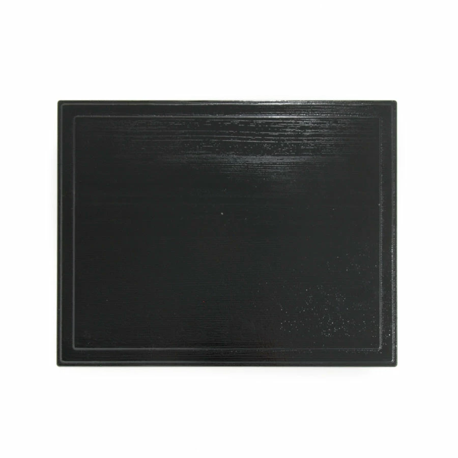 The bento box is designed to resemble traditional Japanese lacquered wood. The outside of the box is black with a wood-grain texture, while the interior is a glossy red.
