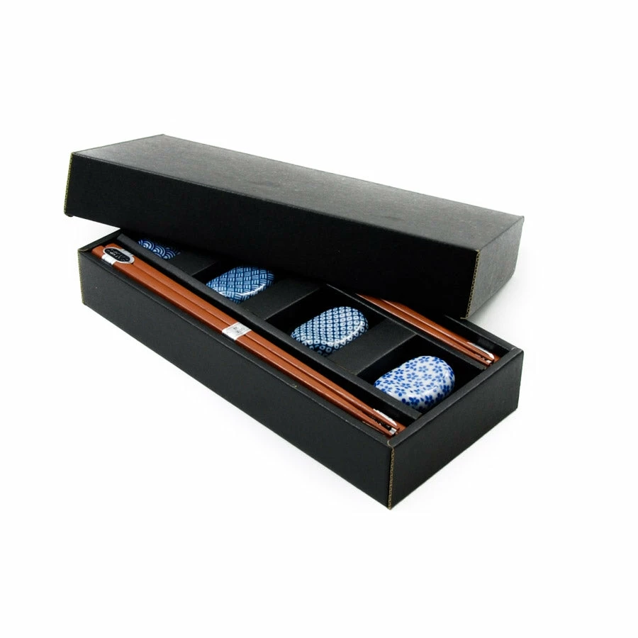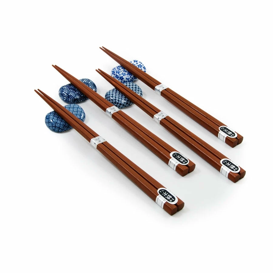 The blue Japanese chopstick & rest set is an instant and elegant Japanese table setting for four people. The set includes four pairs of dark wooden chopsticks with porcelain chopstick rests.