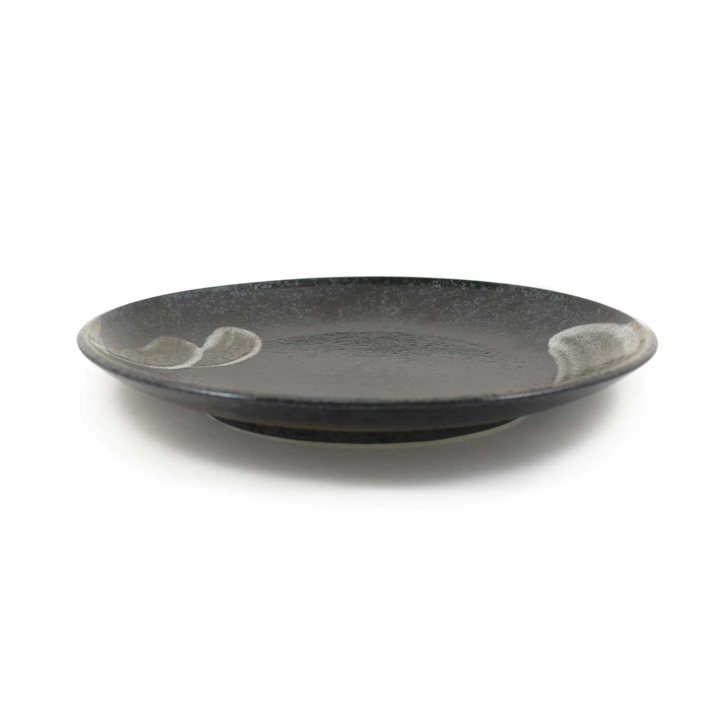 “Karasuba-iro” means glossy black in Japanese, and this glazed ceramic plate has a beautiful glossy black and grey speckled surface. Additional red-brown detailing and white sweeps add to the elegance of the design.