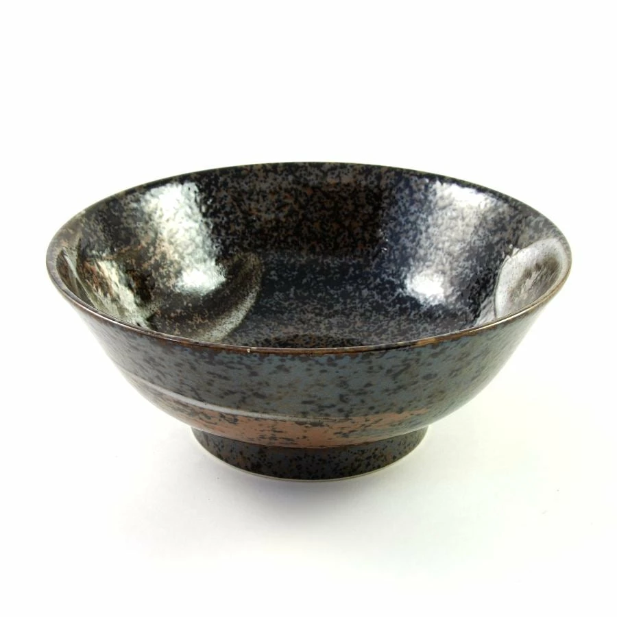 “Karasuba-iro” means glossy black in Japanese, and this glazed ceramic ramen bowl, has a beautiful glossy black and grey speckled surface. Additional red-brown detailing, and white sweeps add to the elegance of the design. This shape and size of Japanese bowl is perfect for serving noodle or ramen dishes.