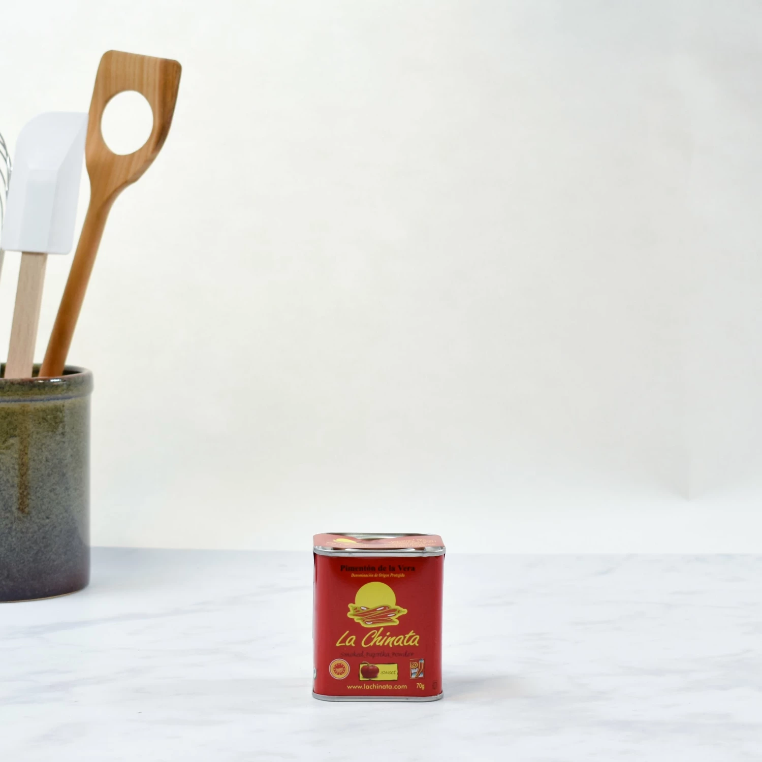 This sweet smoked paprika, or pimentón, is ground from sweet red peppers grown in the Extremadura region south-west of Madrid. The Spanish paprika peppers are oak-smoked, infusing them with woody notes, and then ground in stone mills to keep temperatures low and help retain natural flavours. This distinctive sweet smoked paprika has earned itself “Pimentón de la Vera” DOP status (Protected Denomination of Origin.) La Chinata sweet smoked paprika has a slightly coarser grind than Santa Domingo sweet smoked paprika.