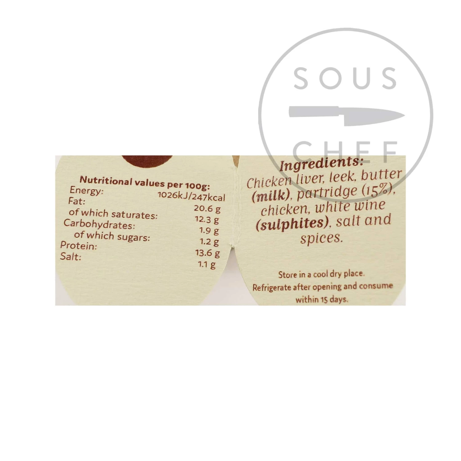 Ingredients: chicken liver, leek, butter (milk), partridge (15%), chicken, white wine (sulphites), salt and spices.