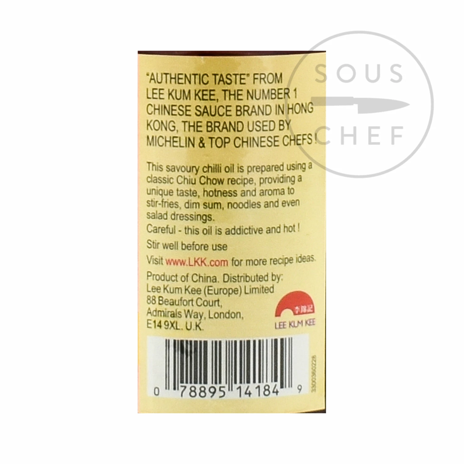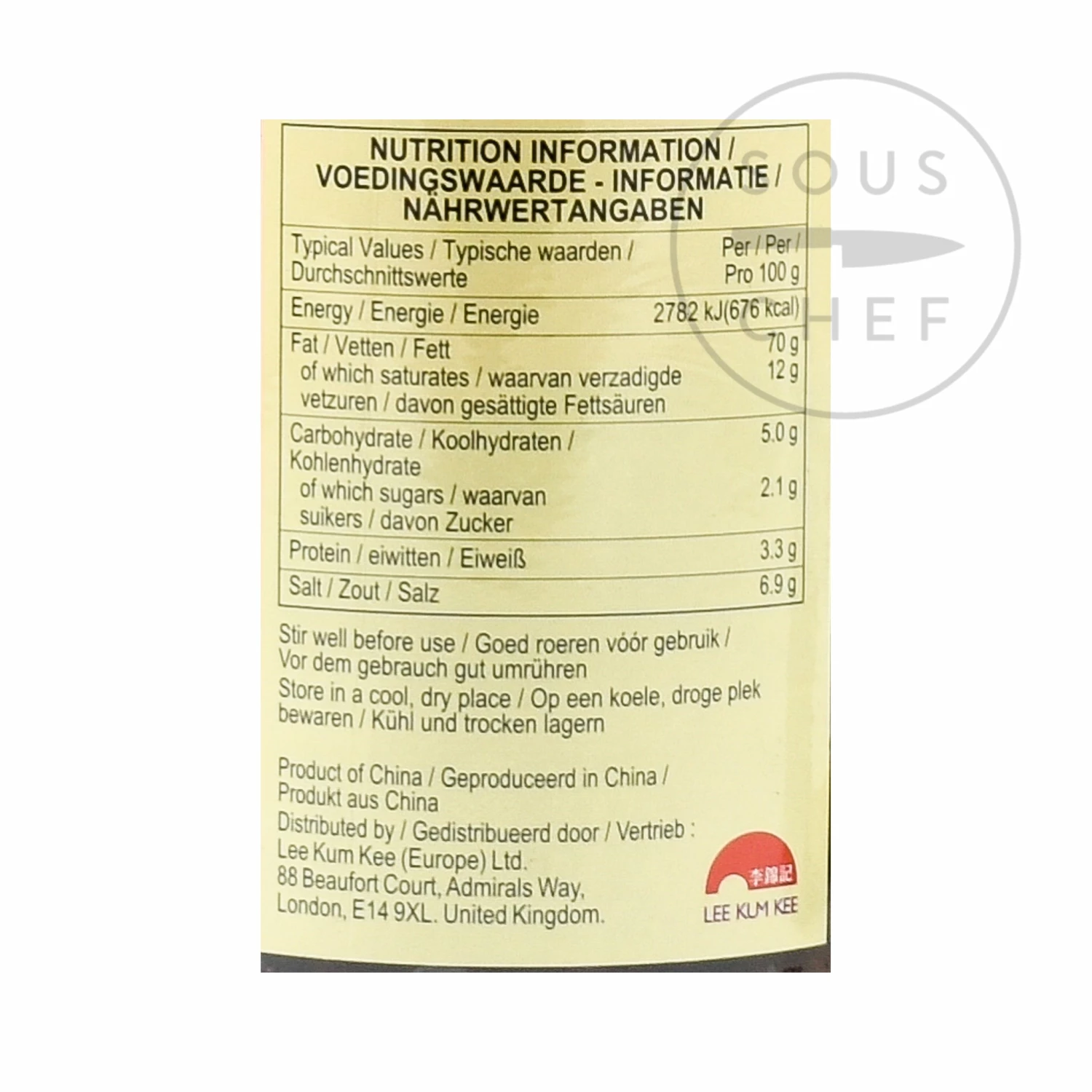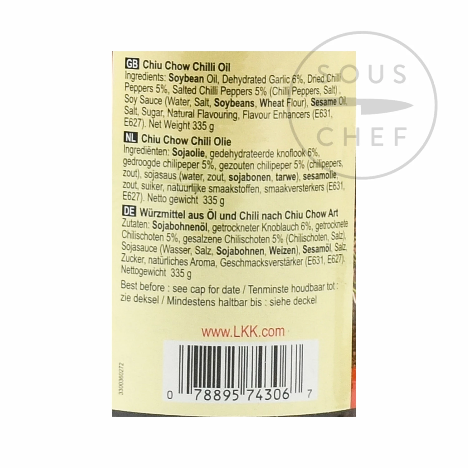 Ingredients: Soybean Oil, Dehydrated Garlic 6%, Dried Chilli Peppers 5%, Salted Chilli Peppers 5%, Soy Sauce (Water, Salt, Soybeans, Wheat Flour), Sesame Oil, Salt, Sugar, Capsicum Oleoresin, Flavour Enhancers (E361, E627). Allergens are listed in bold.