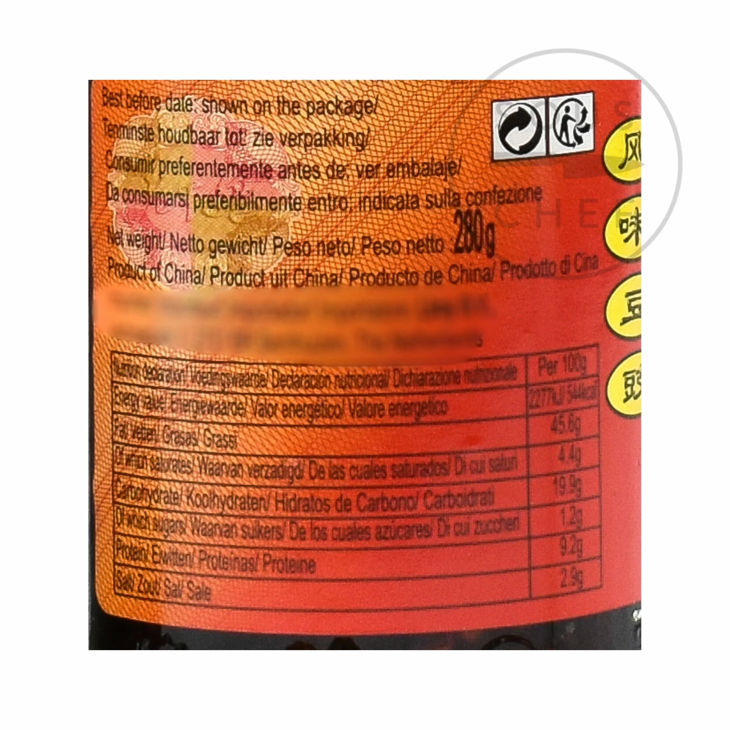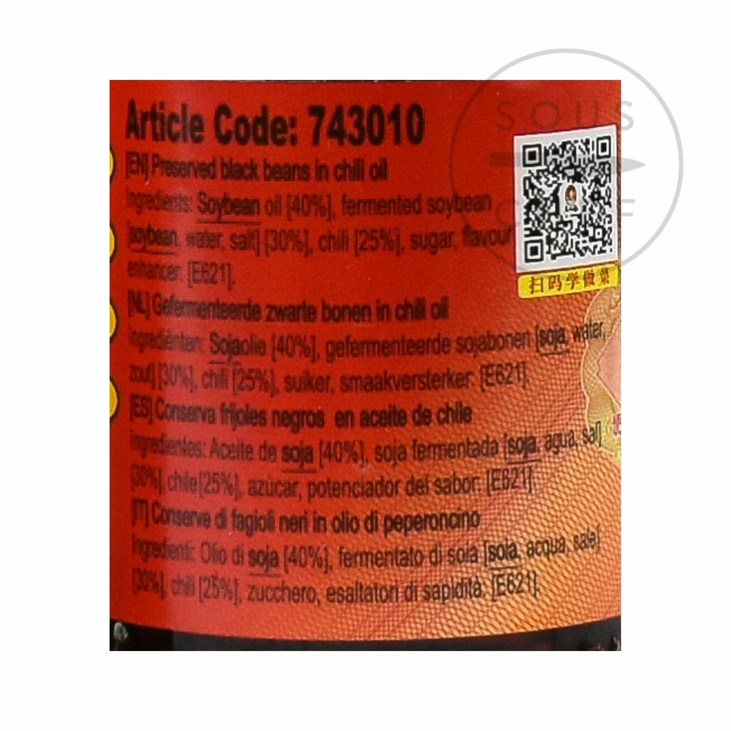 Ingredients: Soybean oil (40%), fermented soybean (soybean, water, salt) (30%), chilli (25%), sugar, flavour enhancer: E621.