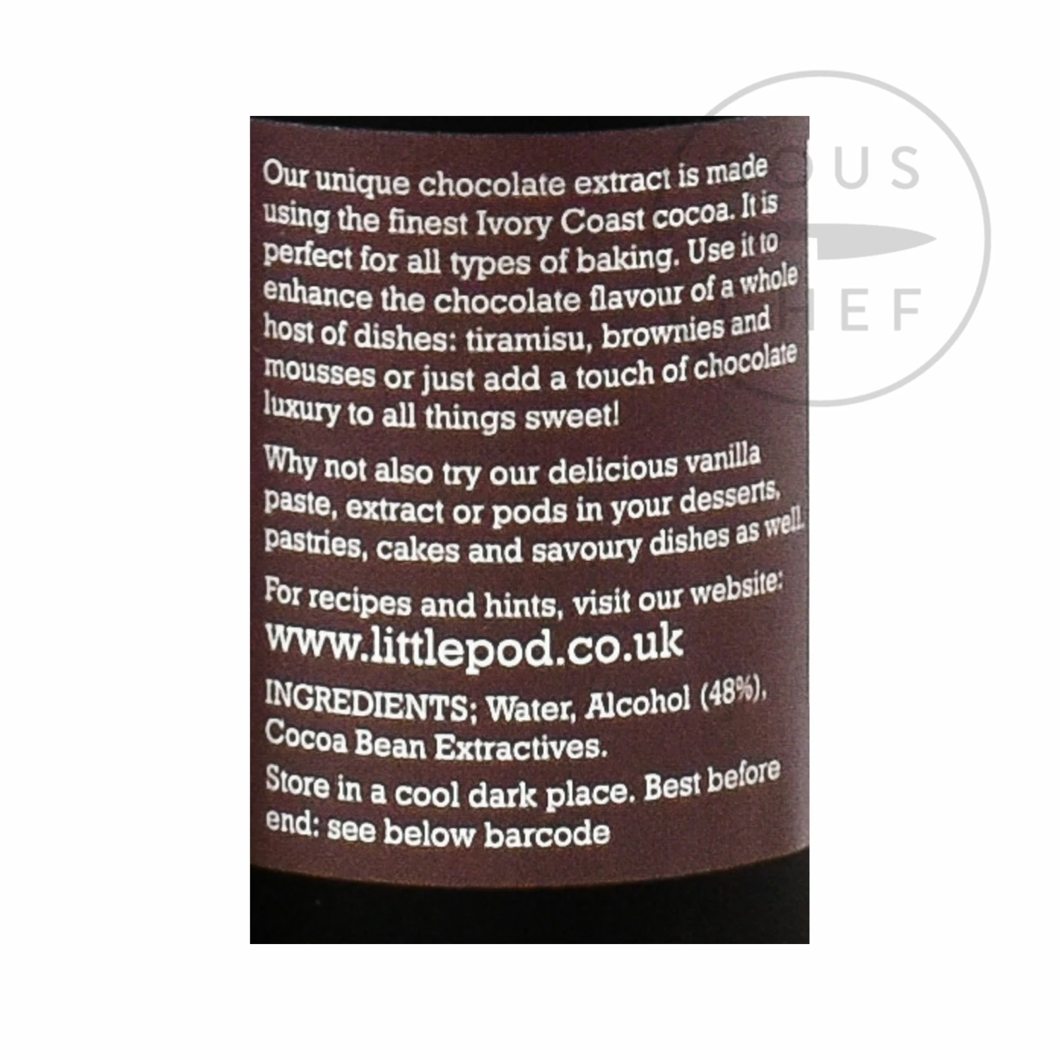 Littlepod pure chocolate extract is a natural flavouring made from Ivory Coast cocoa beans, used in tiramisu, brownies, sponges and mousses. This chocolate extract adds an extra chocolate intensity to make different desserts and puddings stand out from the crowd.
