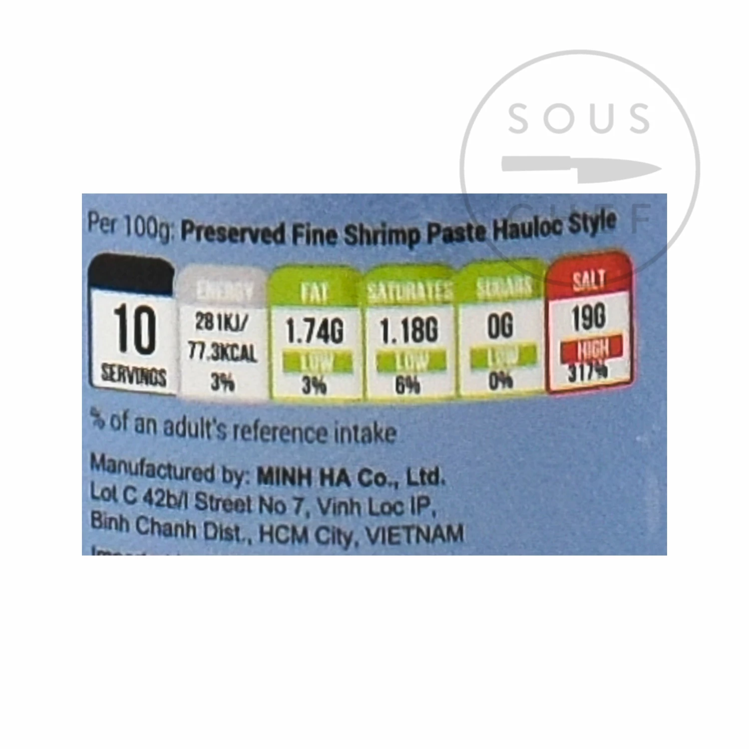 Ingredients: Ground small shrimp (crustacean)(75%), salt (24.9%), preservative: E202 (0.1%) Allergens are listed in bold.