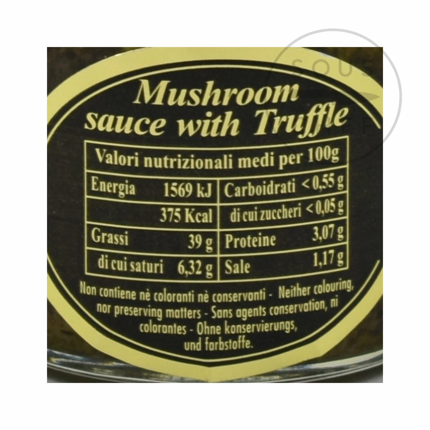 Ingredients: mushrooms (Agaricus bisporus)70%, extra virgin olive oil, summer truffle (tuber aestivum vitt) 3%, lemon juice, salt, aromatic herbs, spices, natural flavourings, aromas. May contain traces of gluten, milk, nuts and anchovies.