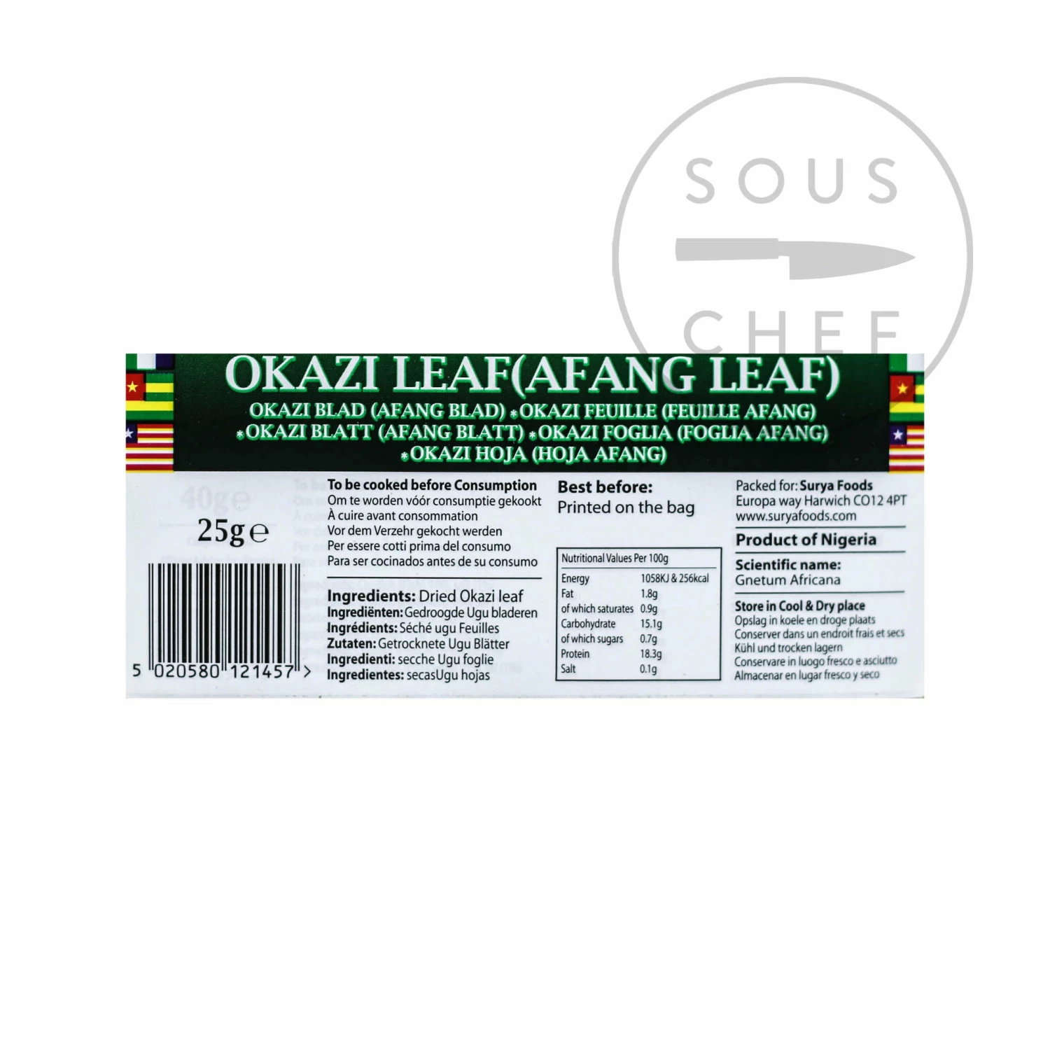 Mother Africa okazi leaves are used to add flavour to soups and stews. The okazi leaf is also known as wild spinach and has a slightly bitter flavour. The green leafy vegetable is used in cooking across Africa and South America, in particular Nigerian afang soups.
