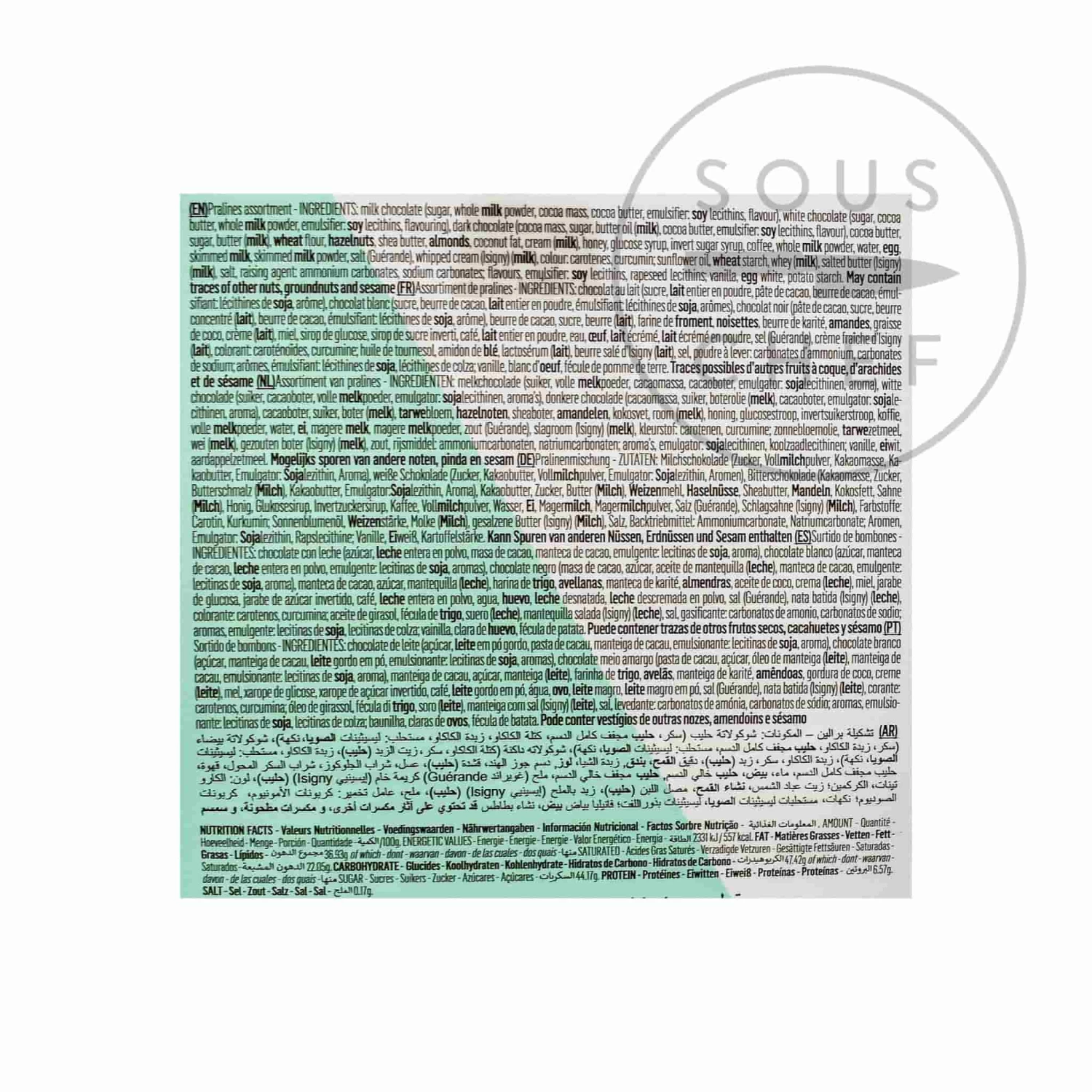 Ingredients: milk chocolate (sugar, whole milk powder, cocoa mass, cocoa butter, emulsifier: soy lecithins, flavour), white chocolate (sugar, cocoa butter, whole milk powder, emulsifier: soy lecithins, flavouring), dark chocolate (cocoa mass, sugar, butter oil (milk), cocoa butter, emulsifier: soy lecithins, flavour), cocoa butter, sugar, butter (milk), wheat flour, hazelnuts, shea butter, almonds, coconut fat, cream (milk), honey, glucose syrup, invert sugar syrup, whole milk powder, water, coffee, egg, skimmed milk, skimmed milk powder, salt (Guérande), whipped cream (Isigny) (milk), colour: carotenes, curcumin; sunflower oil, wheat starch, whey (milk), salted butter (Isigny) (milk), salt, raising agent: ammonium carbonates, sodium carbonates; flavours, emulsifier: soy lecithins, rapeseed lecithins;vanilla, egg white, potato starch.