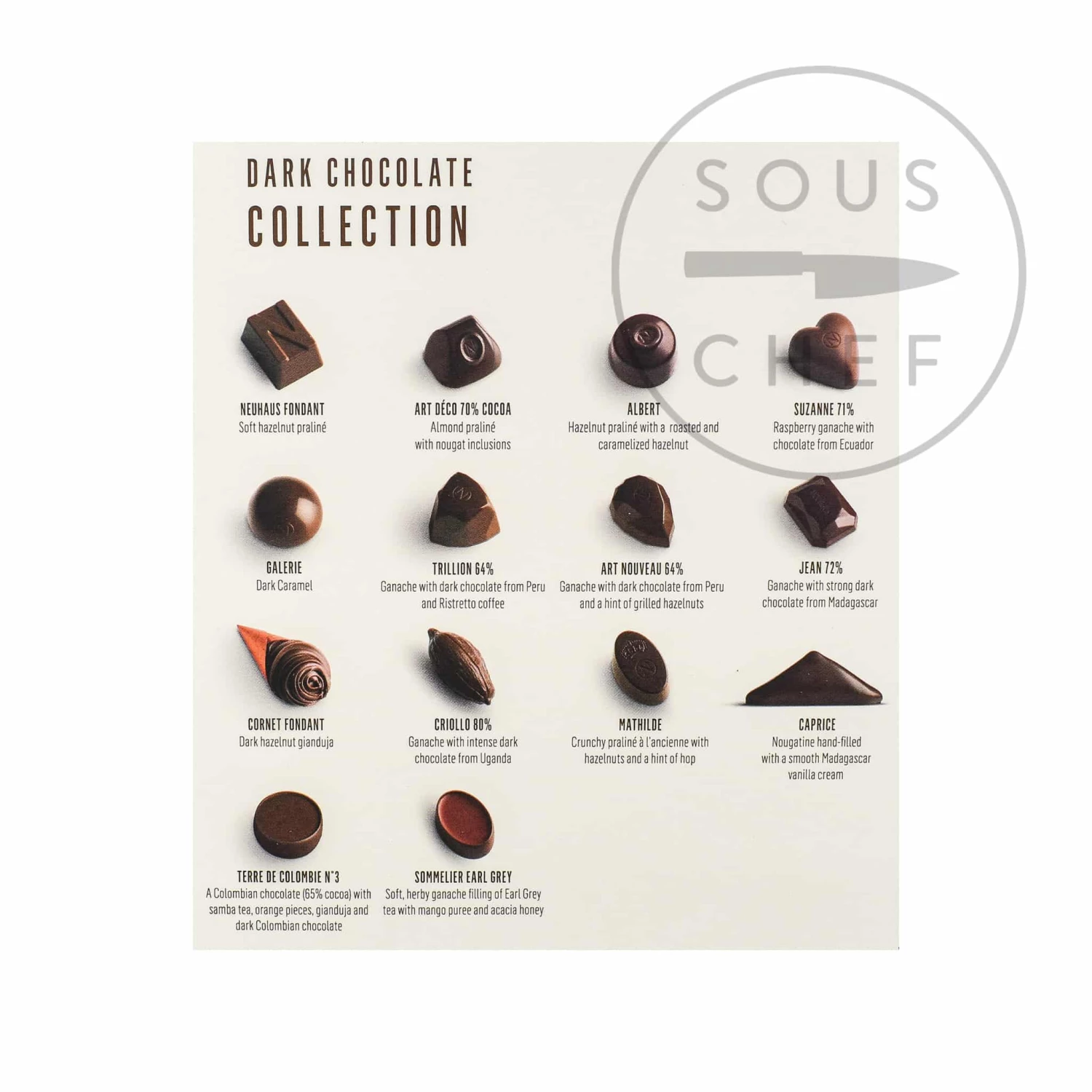 Ingredients: dark chocolate (cocoa mass, sugar, butter oil (milk), cocoa butter, emulsifier: soy lecithins, flavour), sugar, hazelnuts, milk chocolate (sugar, whole milk powder, cocoa mass, cocoa butter, emulsifier: soy lecithins, flavour), cocoa mass, glucose syrup, stabiliser: sorbitols of wheat, cream (milk), cocoa butter, shea butter, coconut fat, invert sugar syrup, humectants: glycerol of rapeseed, butter (milk), candy syrup, almonds, white chocolate (sugar, cocoa butter, whole milk powder, emulsifier: soy lecithins, flavour), nougat chips (almonds, sugar, glucose syrup, honey, egg white, potato starch, water, flavour), skimmed milk, whole milk powder, dextrose, cocoa powder, raspberry, apple paste, flavours, butter oil (milk), sunflower oil, coffee, emulsifier: soy lecithins; water, sugar syrup, candied orange (orange peel, sugar, glucose-fructose syrup, acidity regulator: citric acid), mango, black tea, Earl Grey Tea, honey, fat reduced cocoa powder, whey powder (milk), coloring agent (concentrate of spirulina and apple), skimmed yoghurt powder (milk), vanilla, colour: paprika extract, salt, salt (Guérande), acid: citric acid.